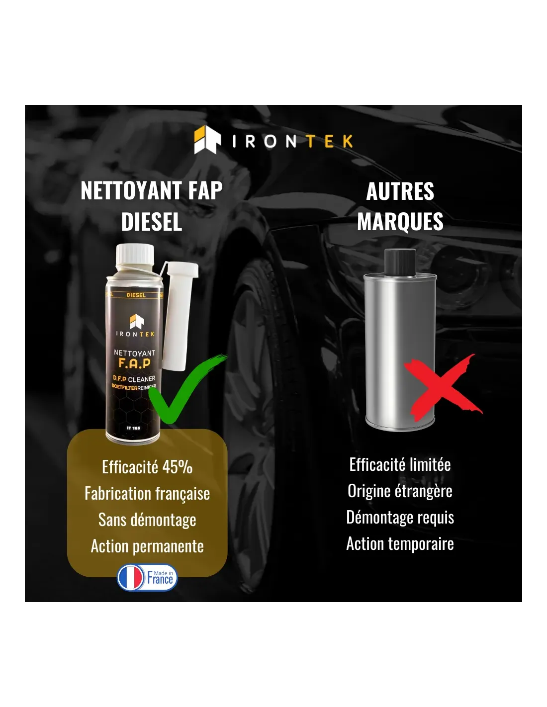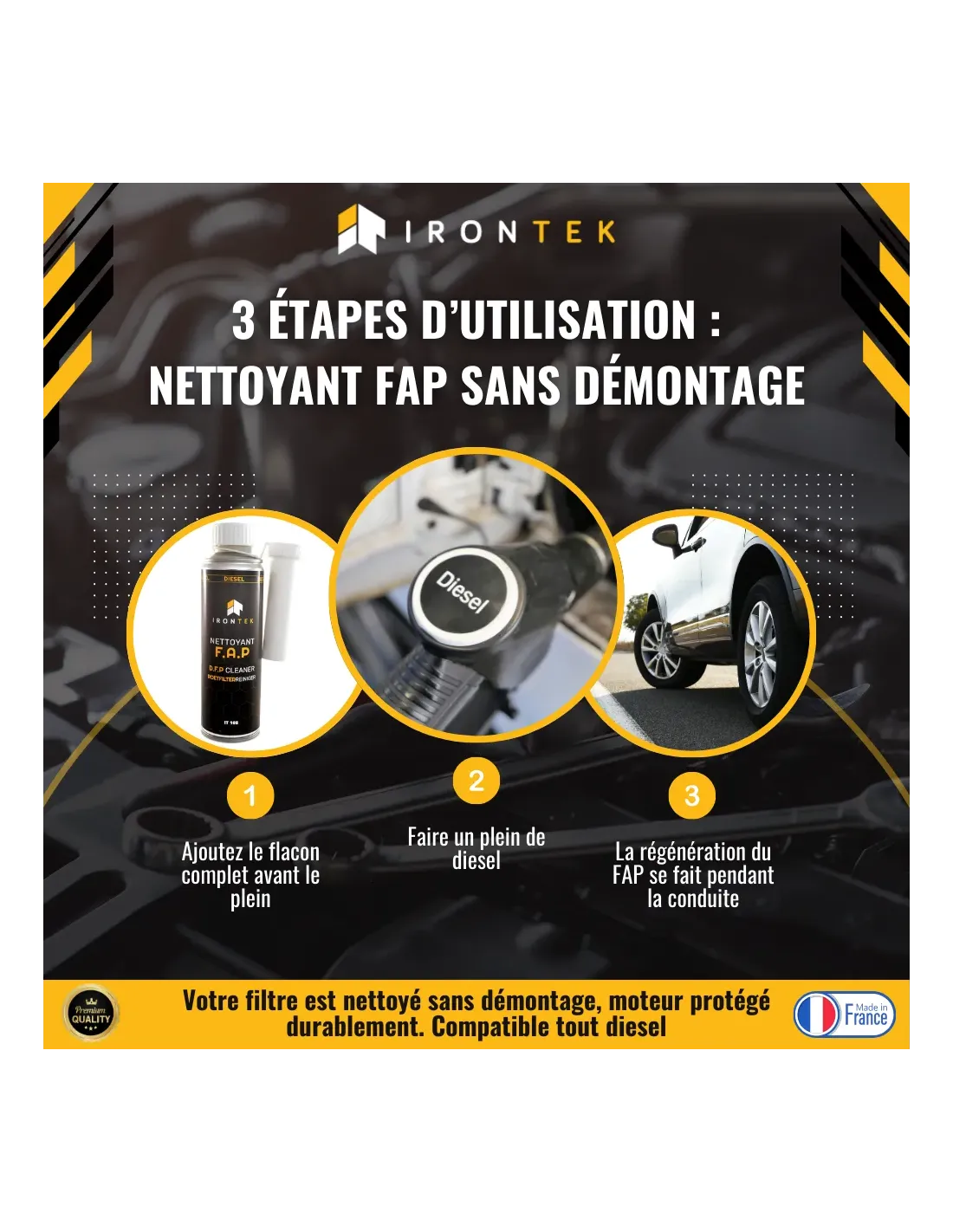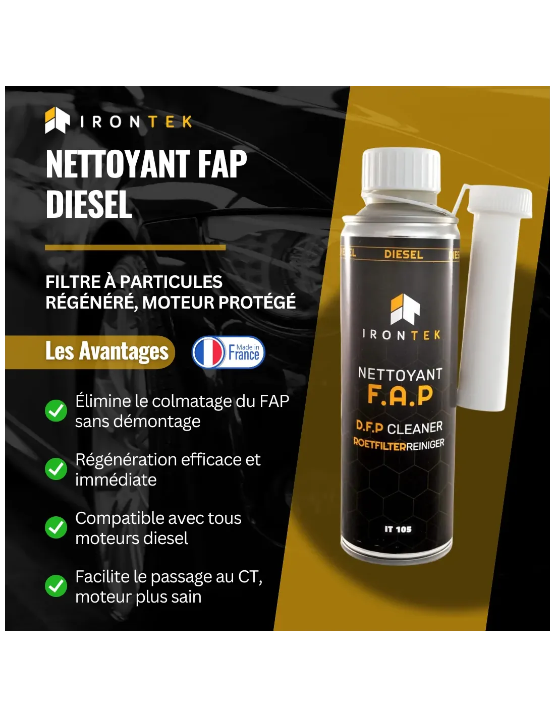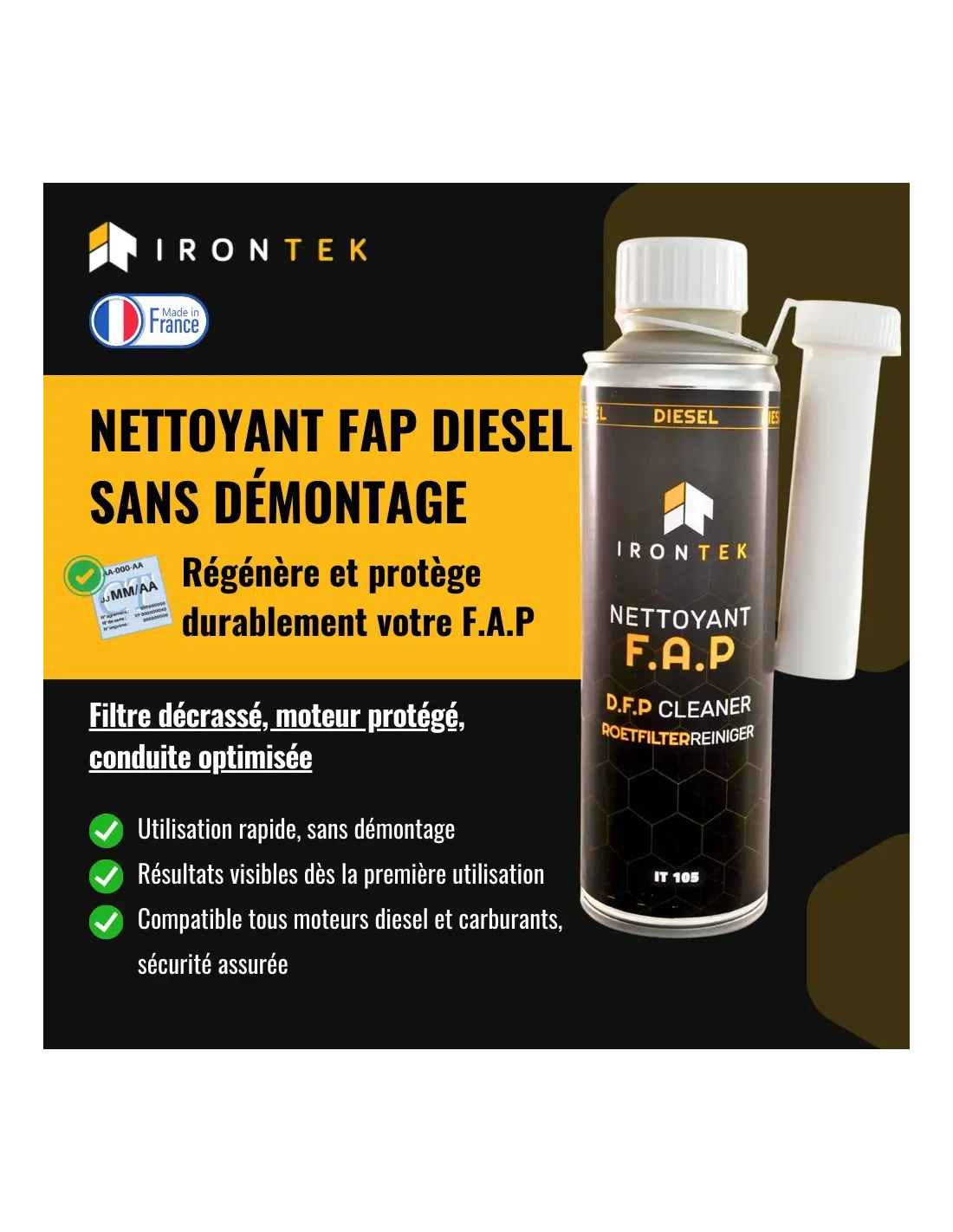 Le traitement anti-pollution FAP IRONTEK est un additif haute performance conçu pour régénérer et protéger efficacement les filtres à particules diesel (FAP), sans démontage ni immobilisation.