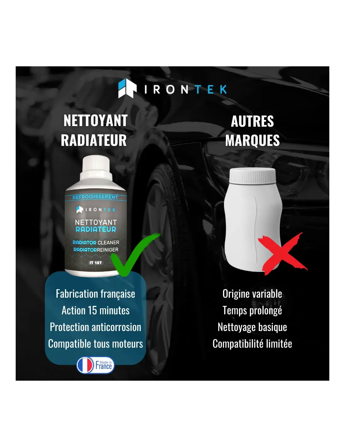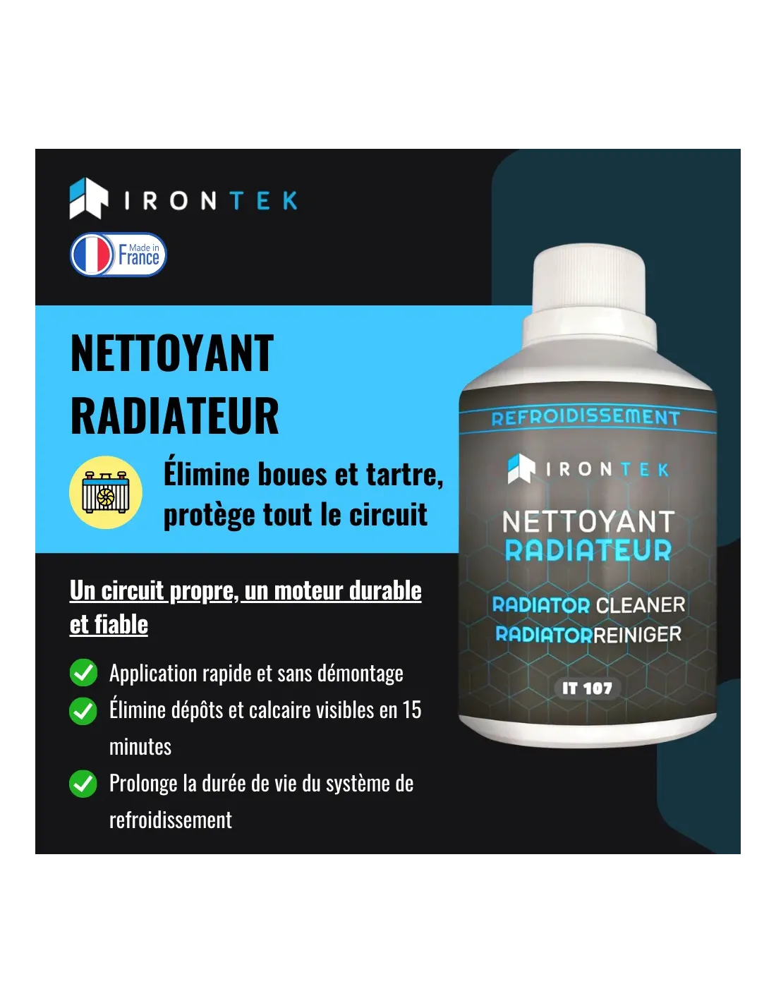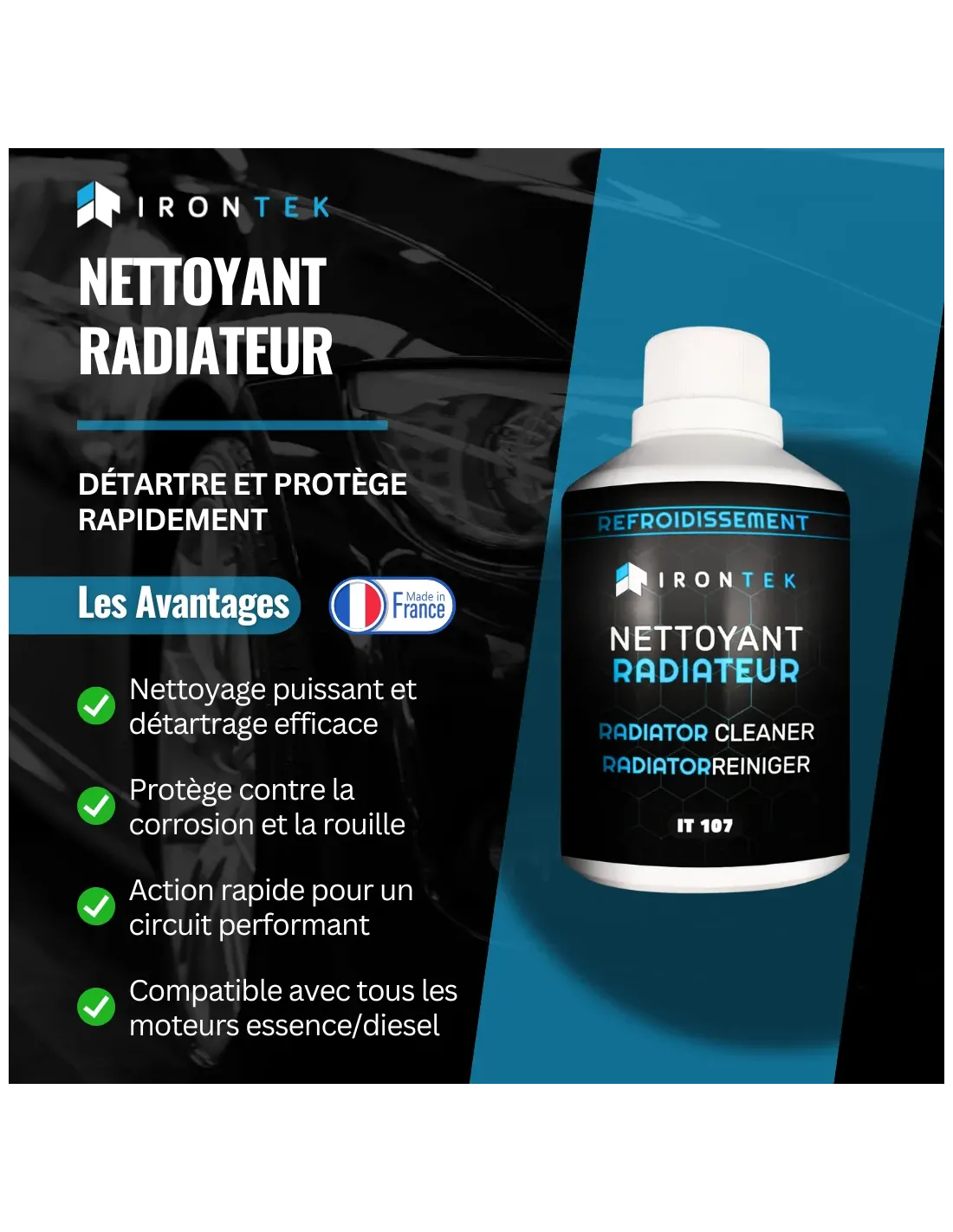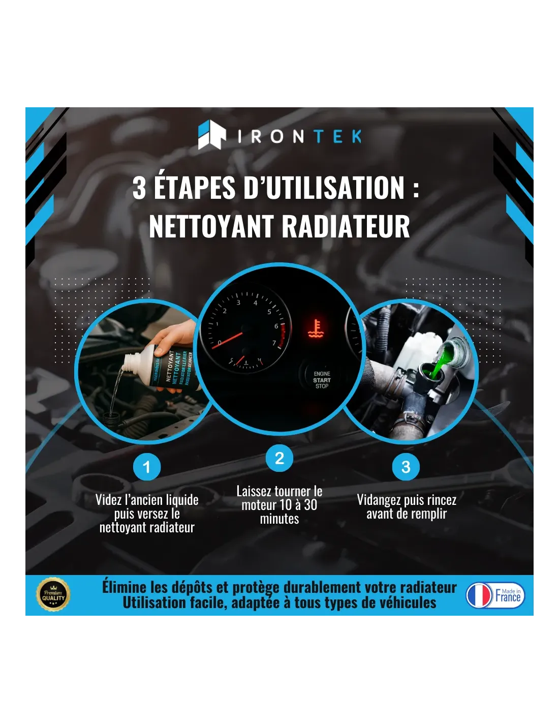 Ce traitement élimine efficacement les boues et le tartre accumulés dans les durites, radiateurs, pompes à eau et thermostats. Il prévient la rouille et prolonge la durée de vie du circuit de refroidissement.