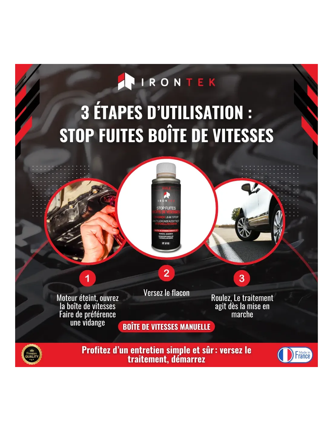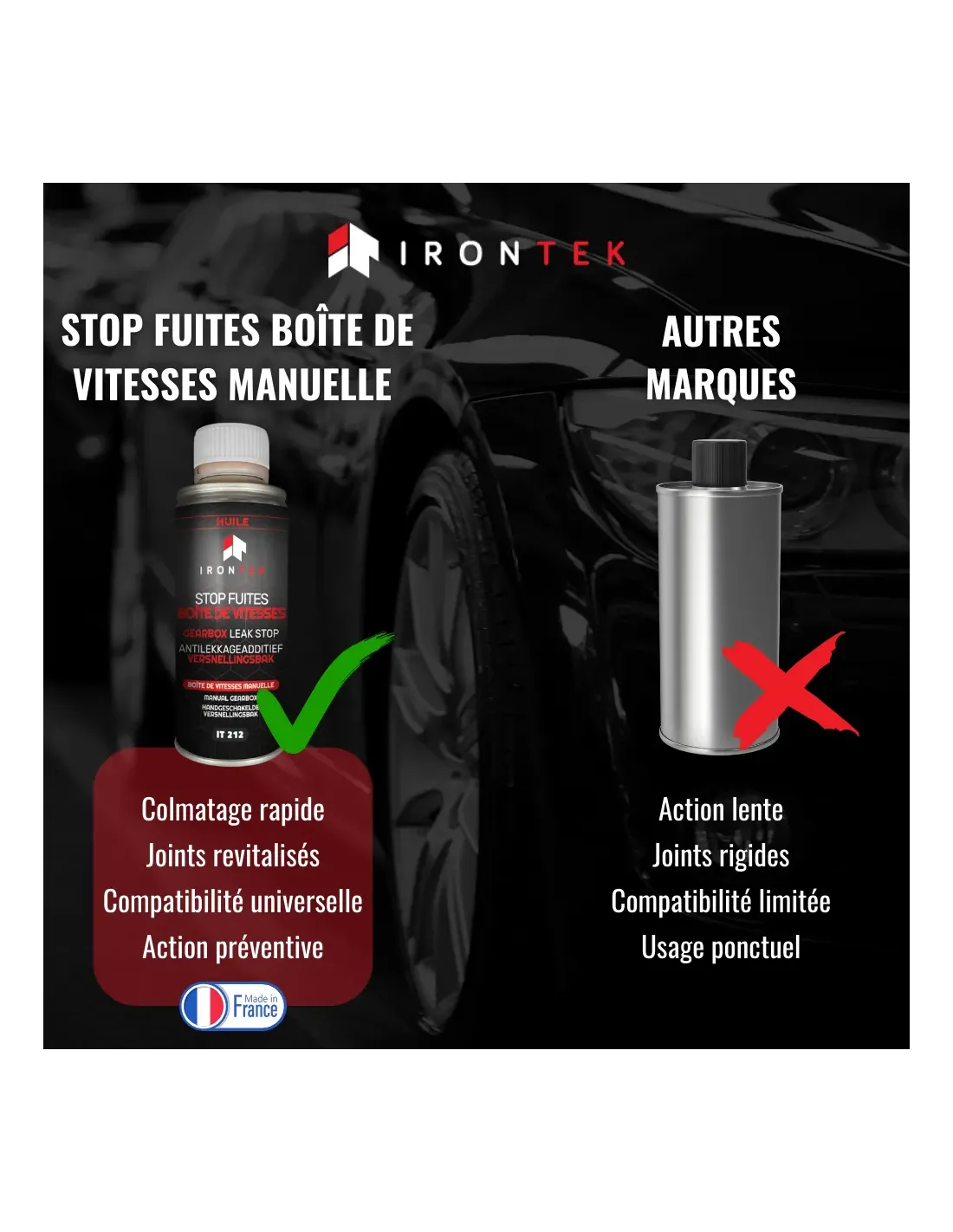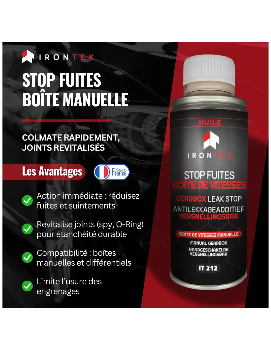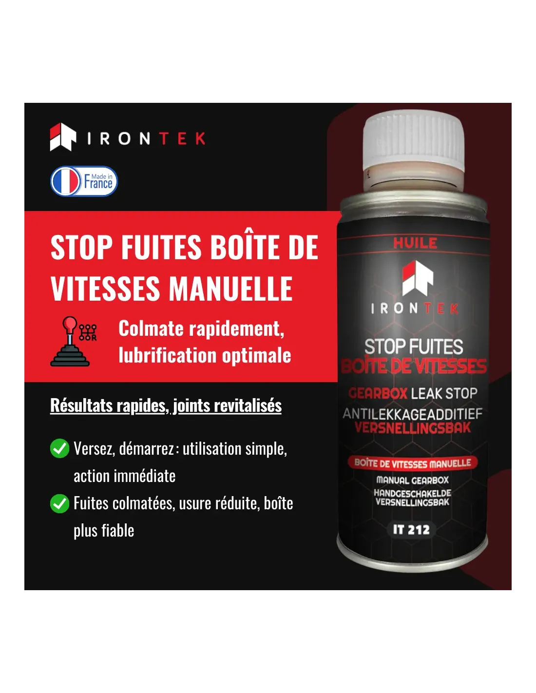 Le Stop Fuite Boîte de Vitesses IRONTEK colmate rapidement les fuites d’huile des boîtes de vitesses manuelles, boîtes de transfert et différentiels. Il protège contre l’usure, revitalise les joints et maintient une lubrification optimale pour prévenir les pannes et garantir la longévité de votre transmission.