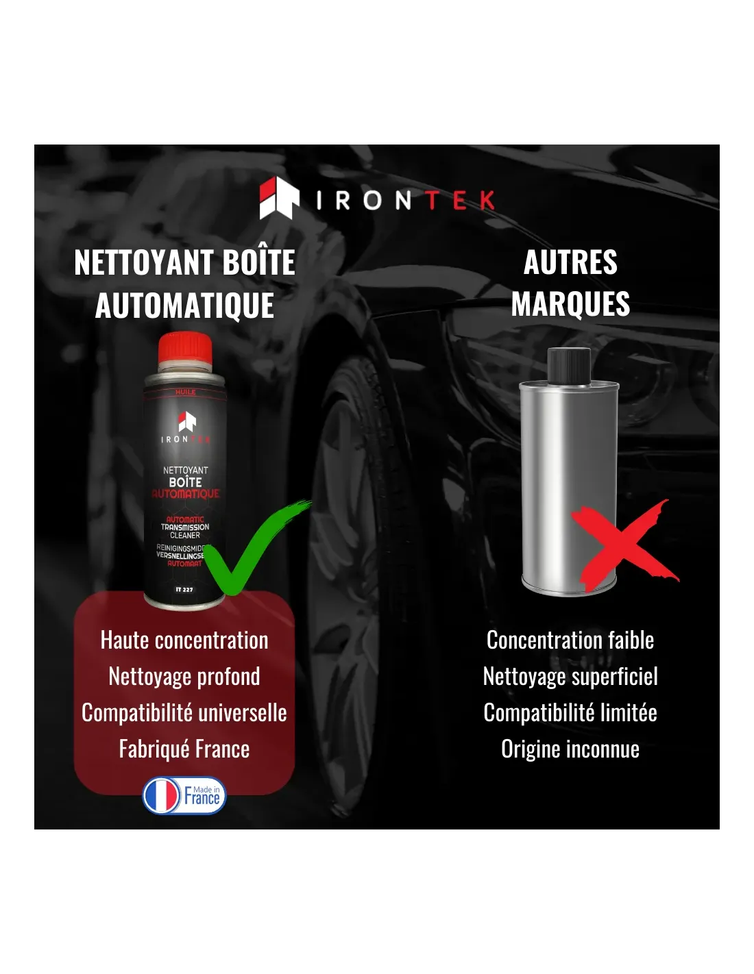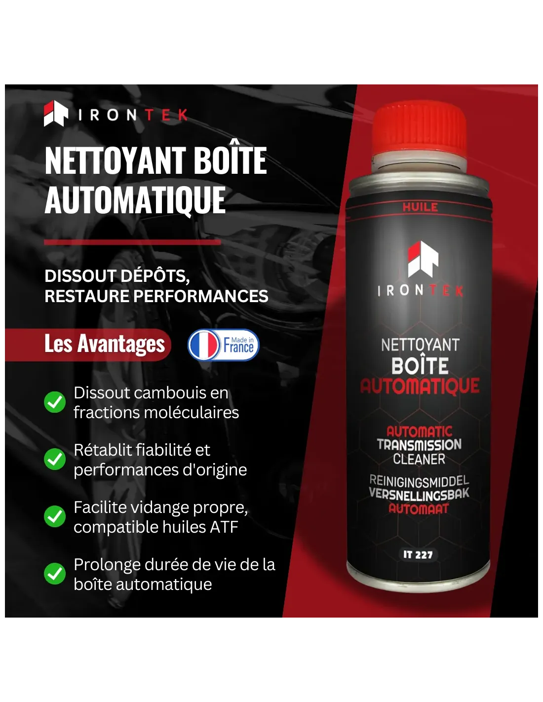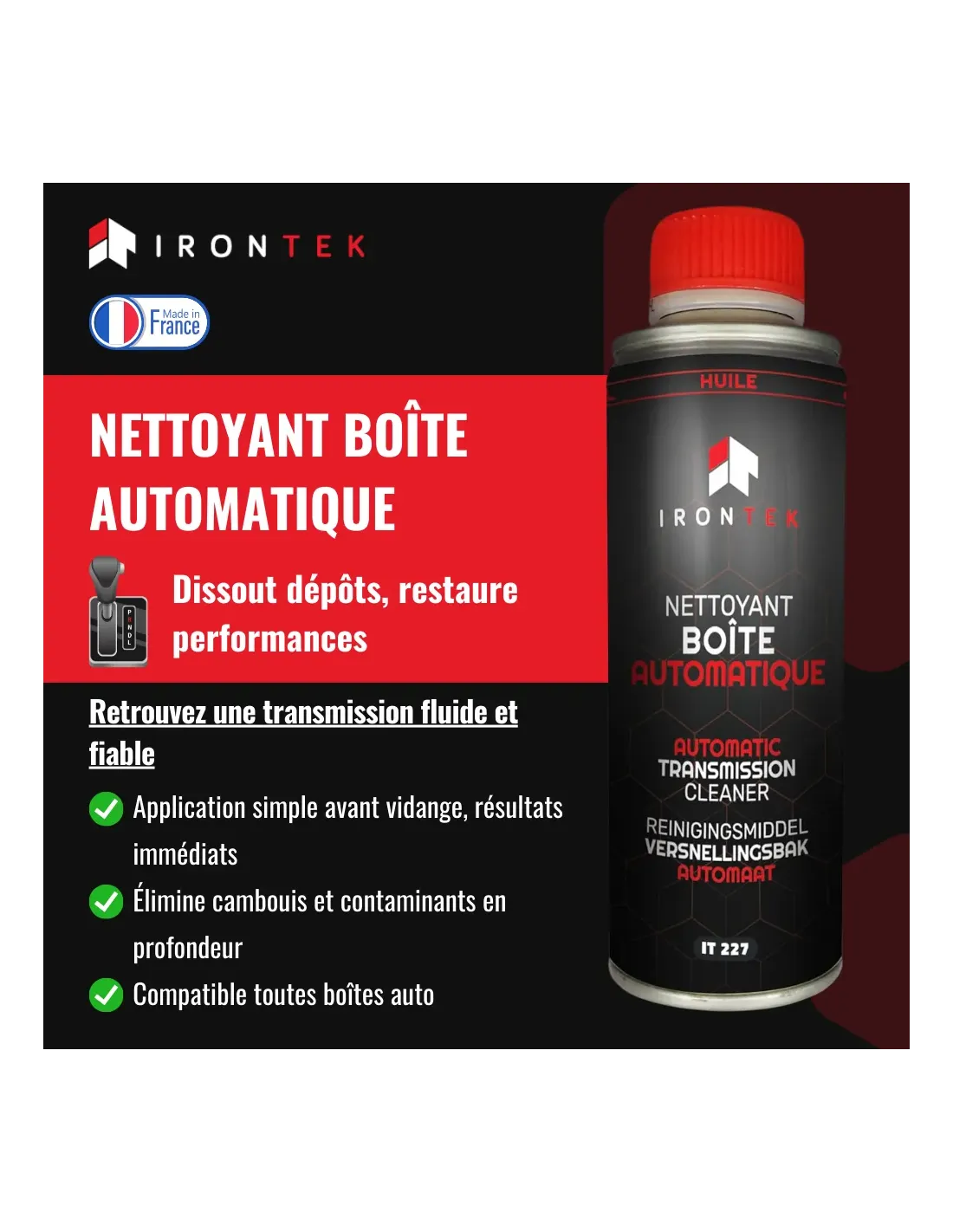 Le Nettoyant Boîte Automatique IRONTEK est un traitement prévidange haute efficacité pour tous types de boîtes de vitesses automatiques.