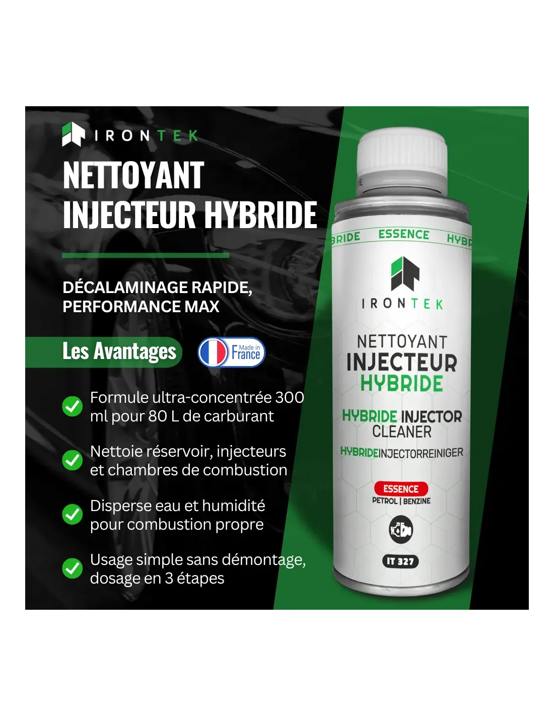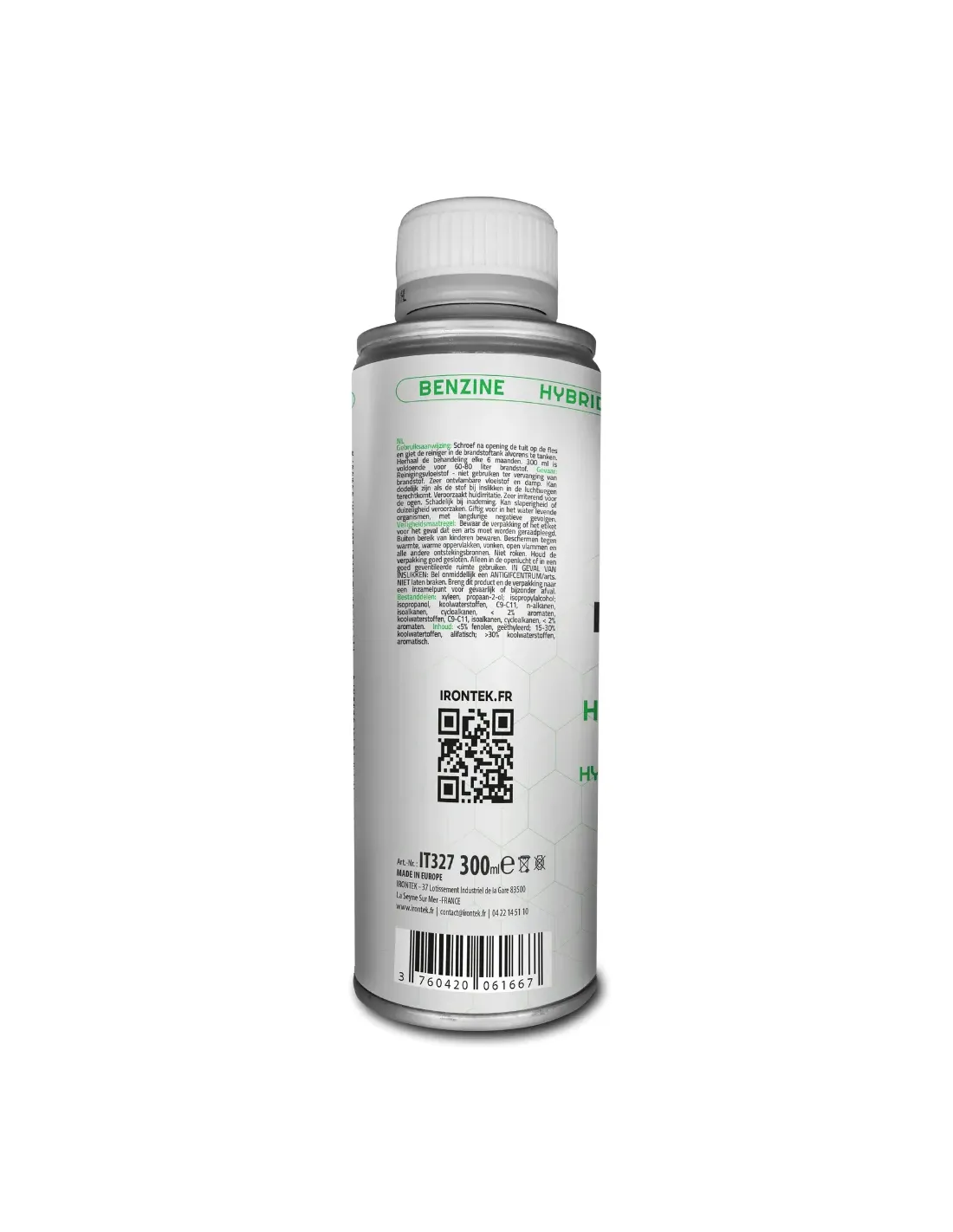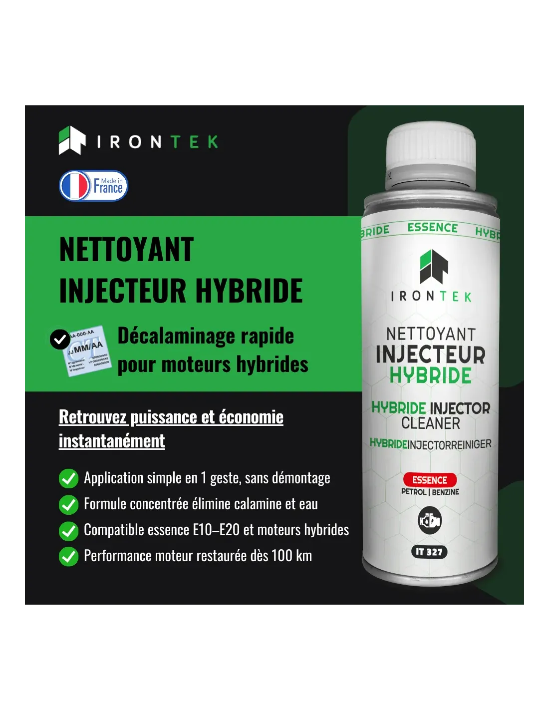 Le Nettoyant Injecteur Hybride Essence IRONTEK est conçu pour l’entretien complet du circuit carburant des moteurs hybrides essence. Il élimine l’encrassement, protège les injecteurs, lutte contre la condensation et préserve la performance et la fiabilité du moteur.