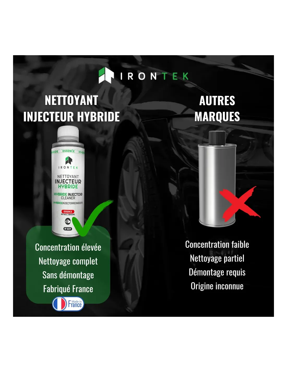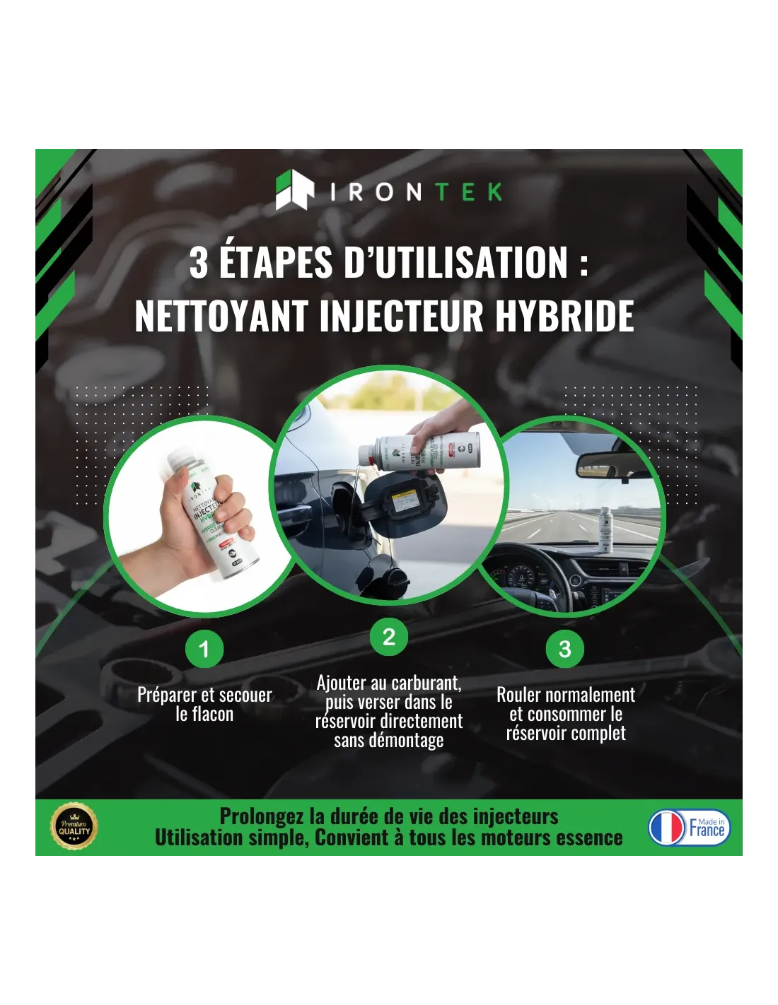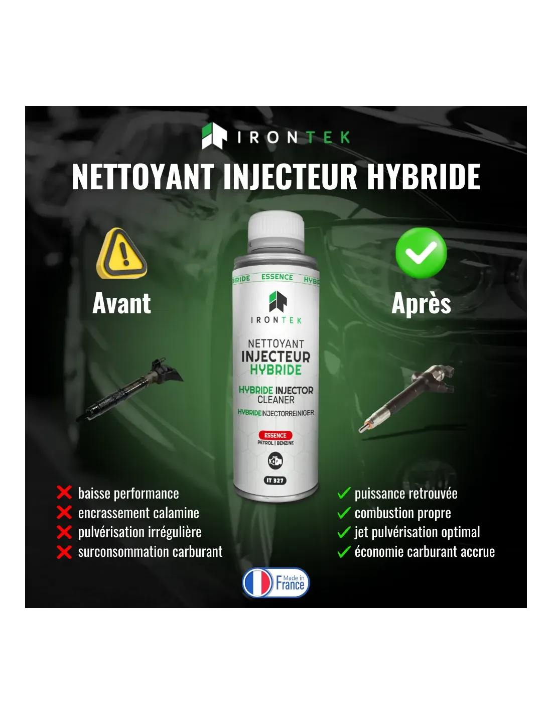 Le Nettoyant Injecteur Hybride Essence IRONTEK est conçu pour l’entretien complet du circuit carburant des moteurs hybrides essence. Il élimine l’encrassement, protège les injecteurs, lutte contre la condensation et préserve la performance et la fiabilité du moteur.