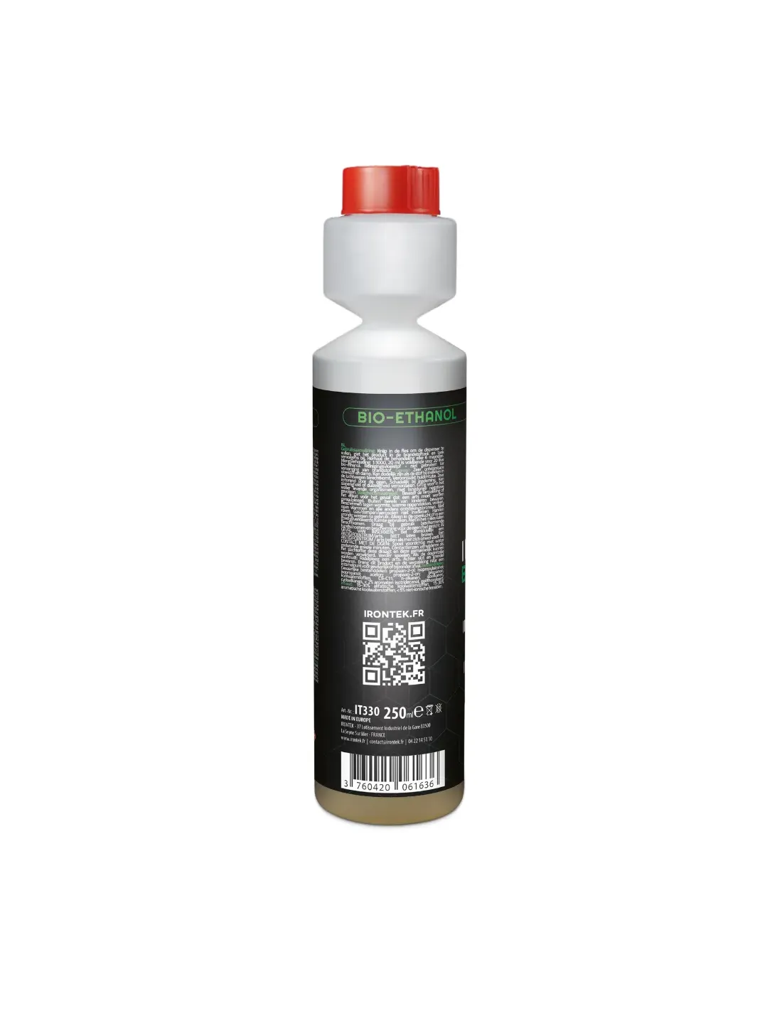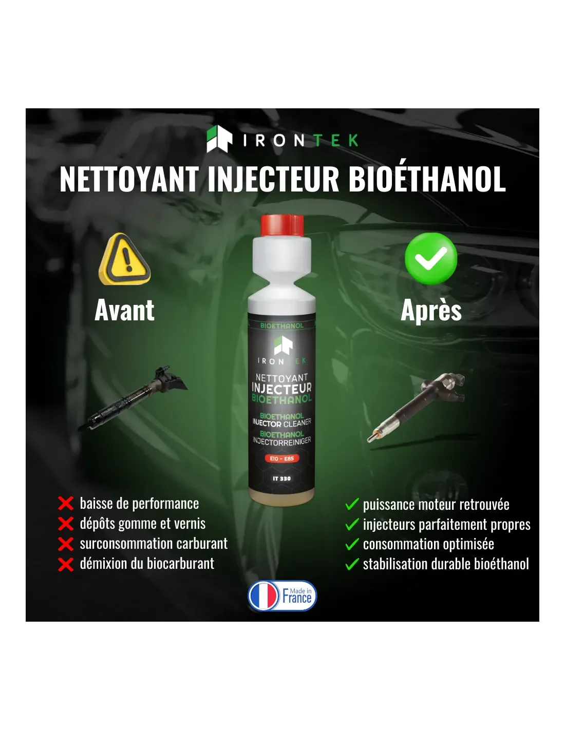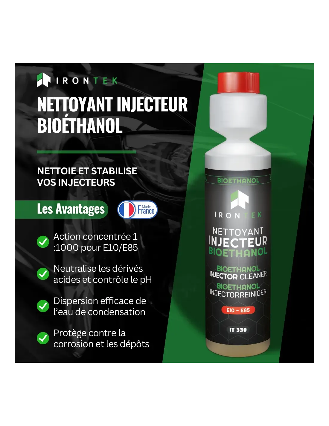 Le Nettoyant Injecteur Bioéthanol IRONTEK est conçu pour l’entretien des moteurs essence utilisant du E10 ou E85. Il stabilise le bioéthanol sur la durée, neutralise les dérivés acides, empêche la démixtion du carburant, et protège tout le système d’injection contre la corrosion et les dépôts.