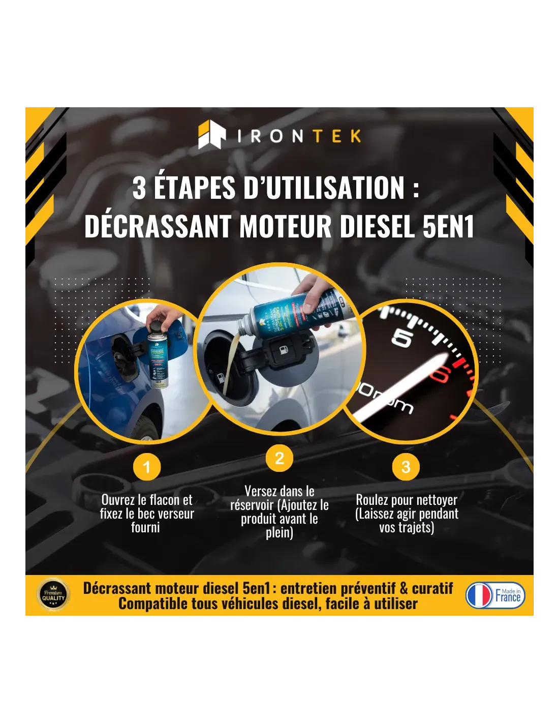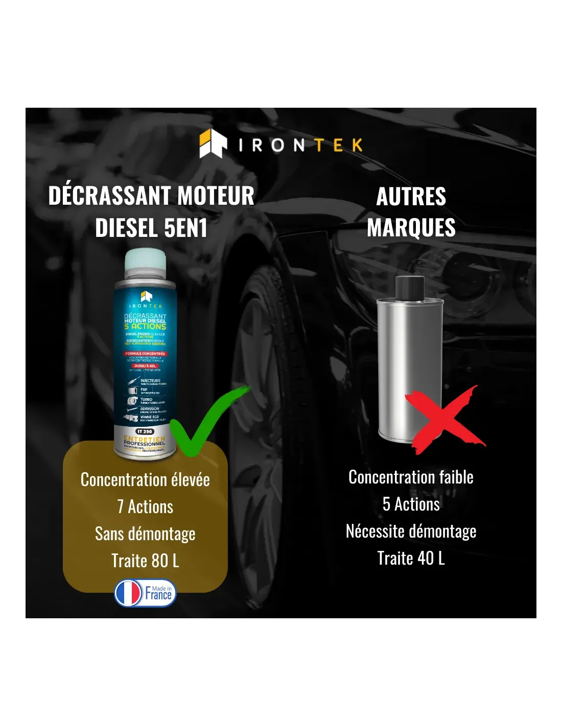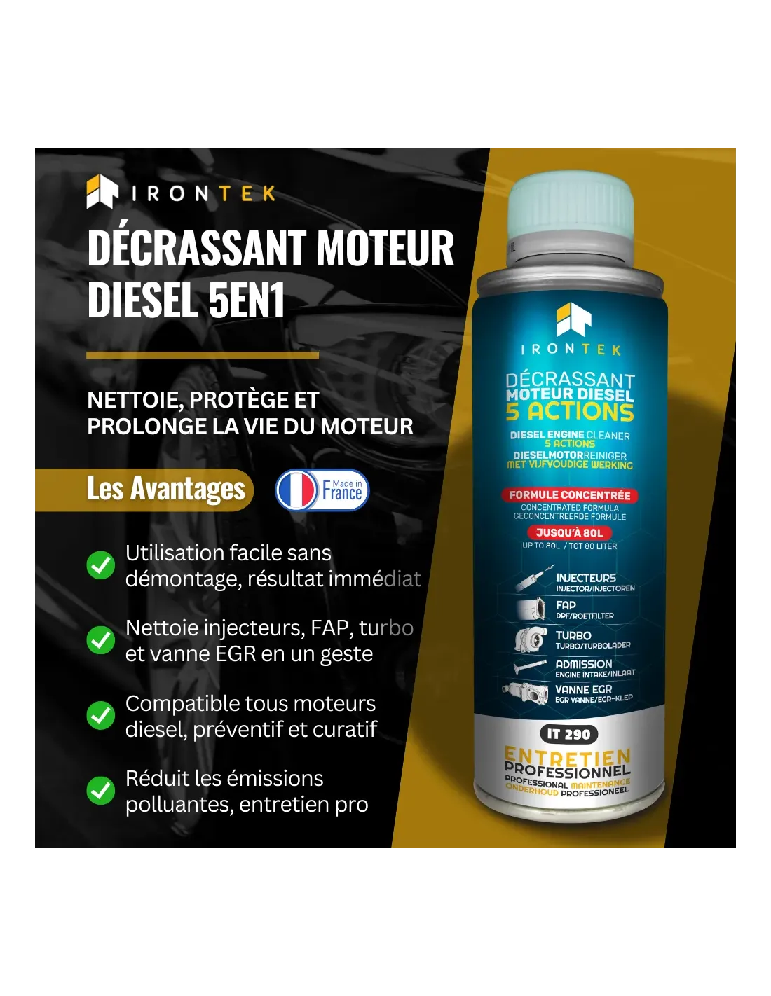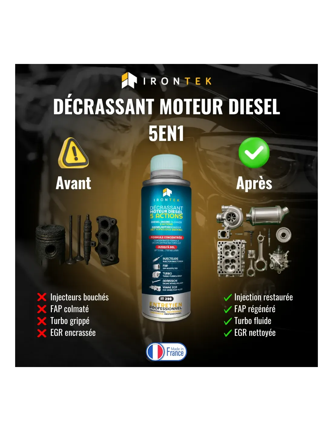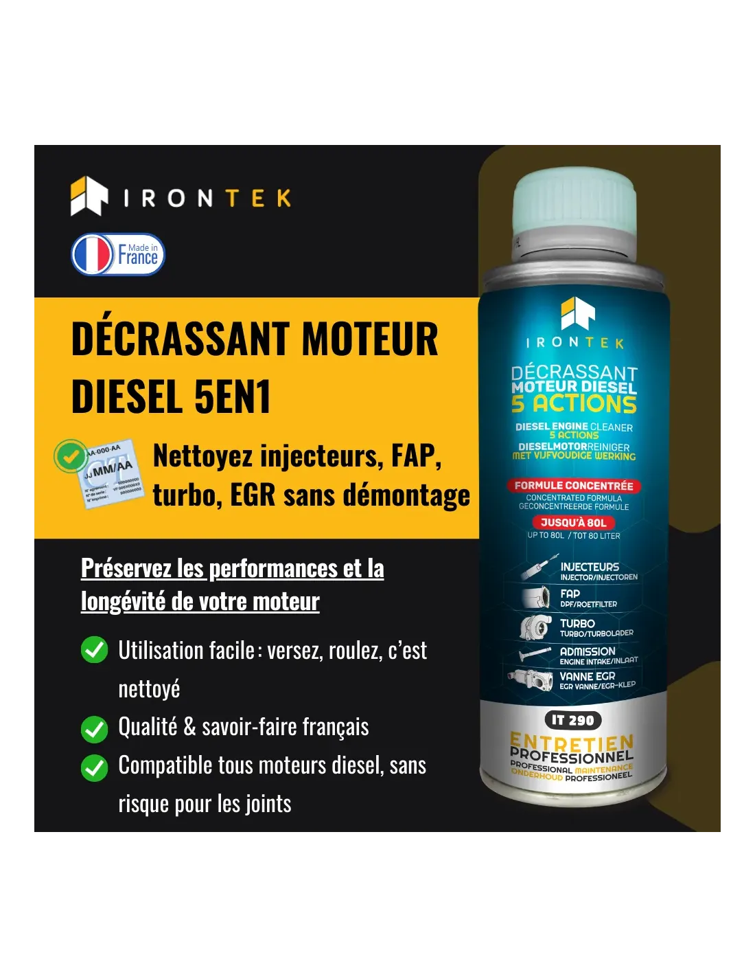 Le Décrassant Moteur Diesel 5 Actions IRONTEK est un traitement haute performance spécialement conçu pour nettoyer et protéger tout le système d’alimentation des moteurs diesel. Sa formule unique agit sur l’injection, le FAP, le turbo, l’admission d’air et les vannes EGR, garantissant une efficacité maximale sans aucun démontage.