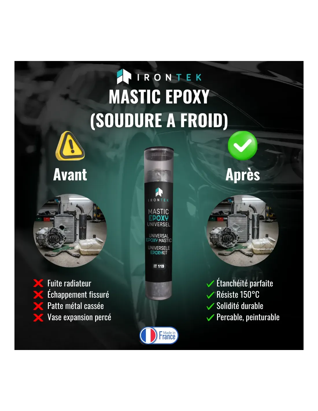 • Réparation de métal cassé : boîte de vitesses, radiateur, vase d’expansion