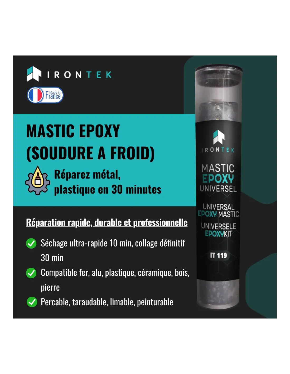 Idéal pour la réparation durable sur fer, aluminium, cuivre, bronze, laiton, bois, élastomère, céramique, pierre, etc.