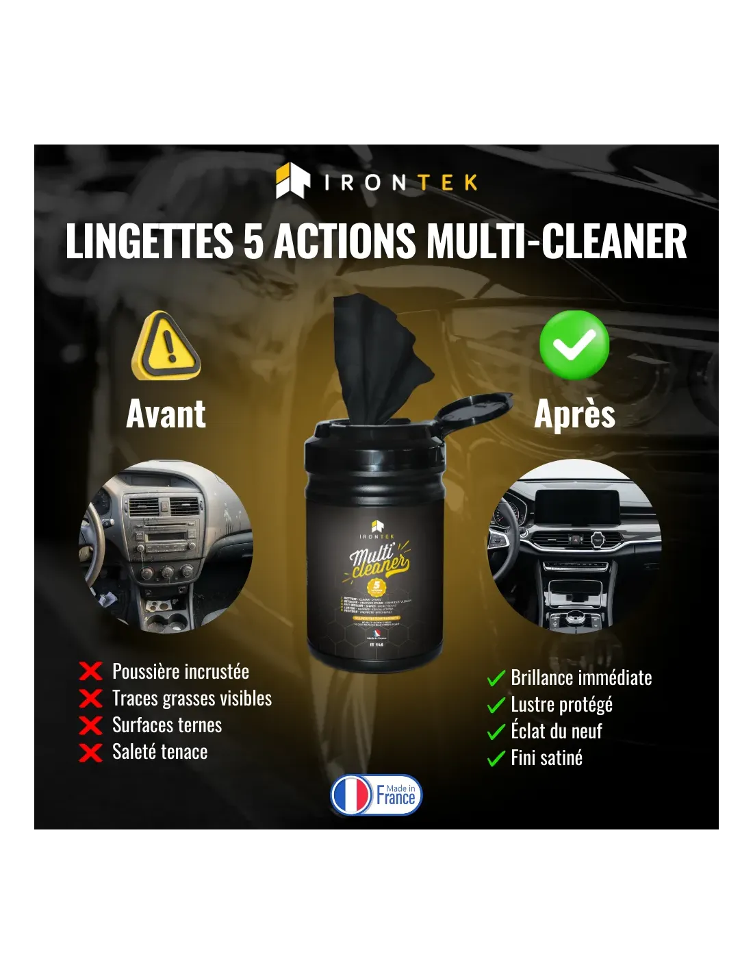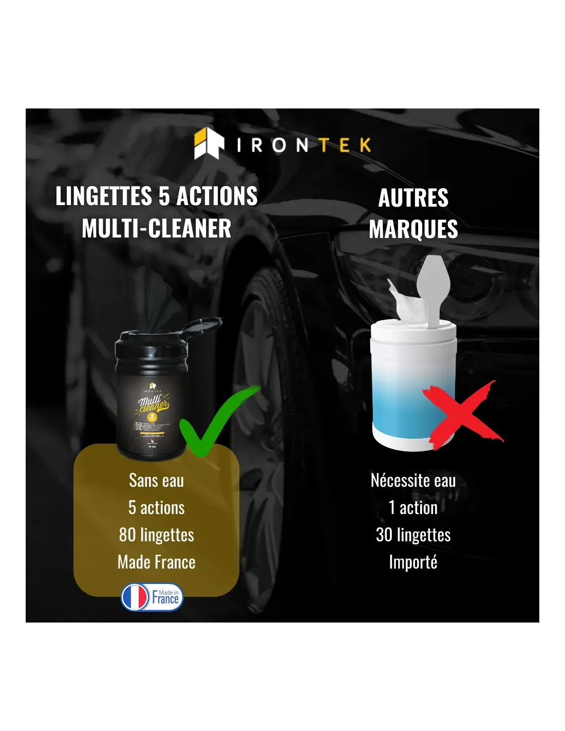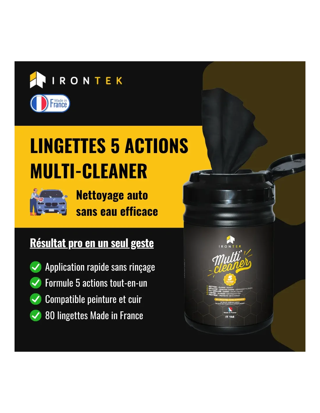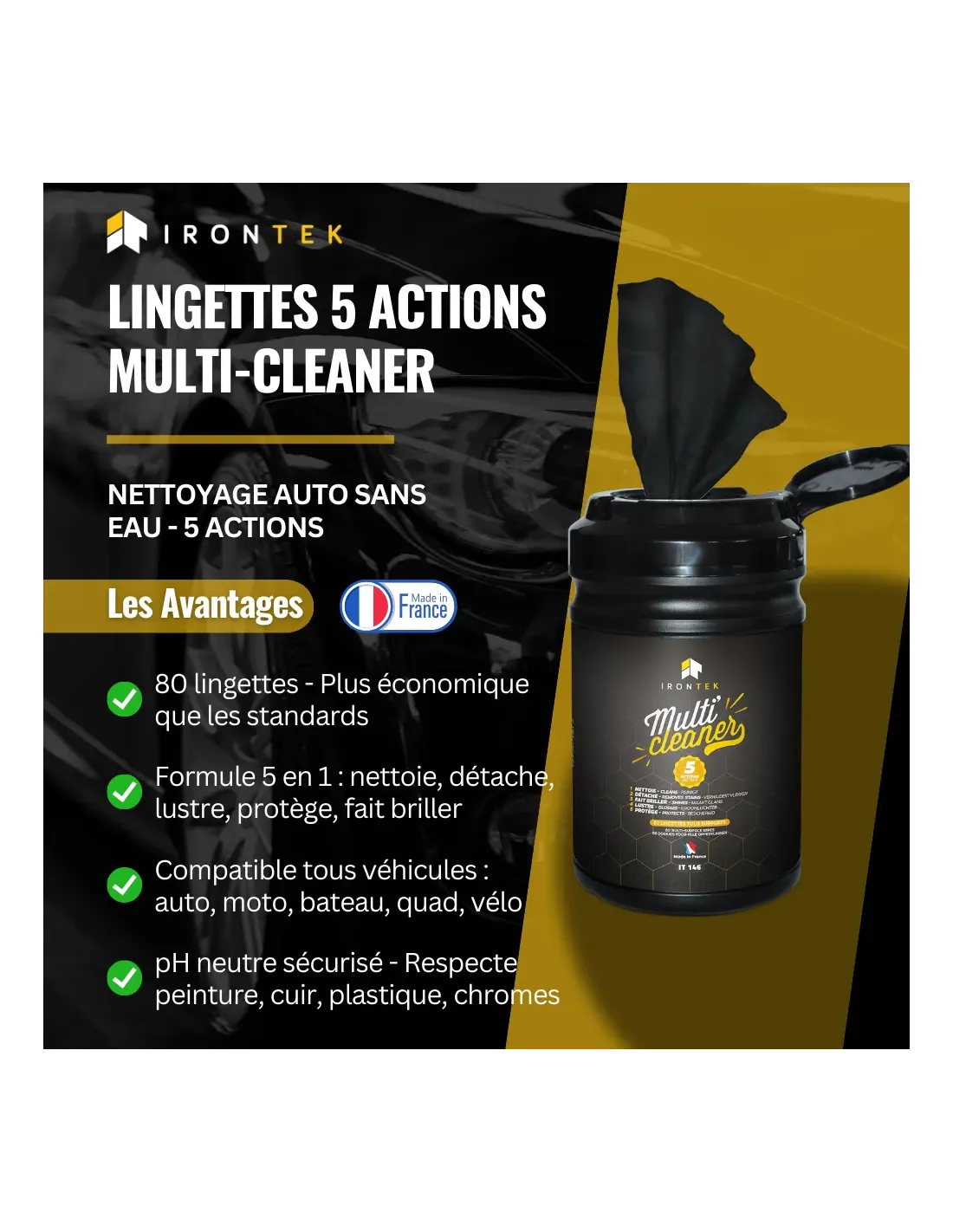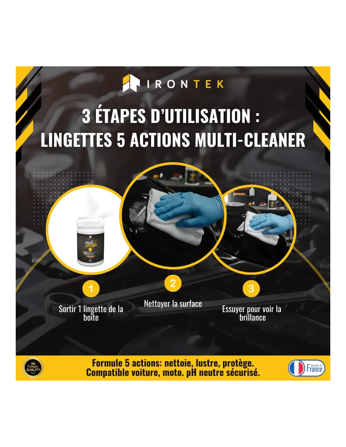 La lingette MULTI’CLEANER IRONTEK nettoie sans eau et sans rinçage pour un entretien rapide ou régulier de tous types de véhicules : voiture, moto, quad, vélo, bateau, kart…