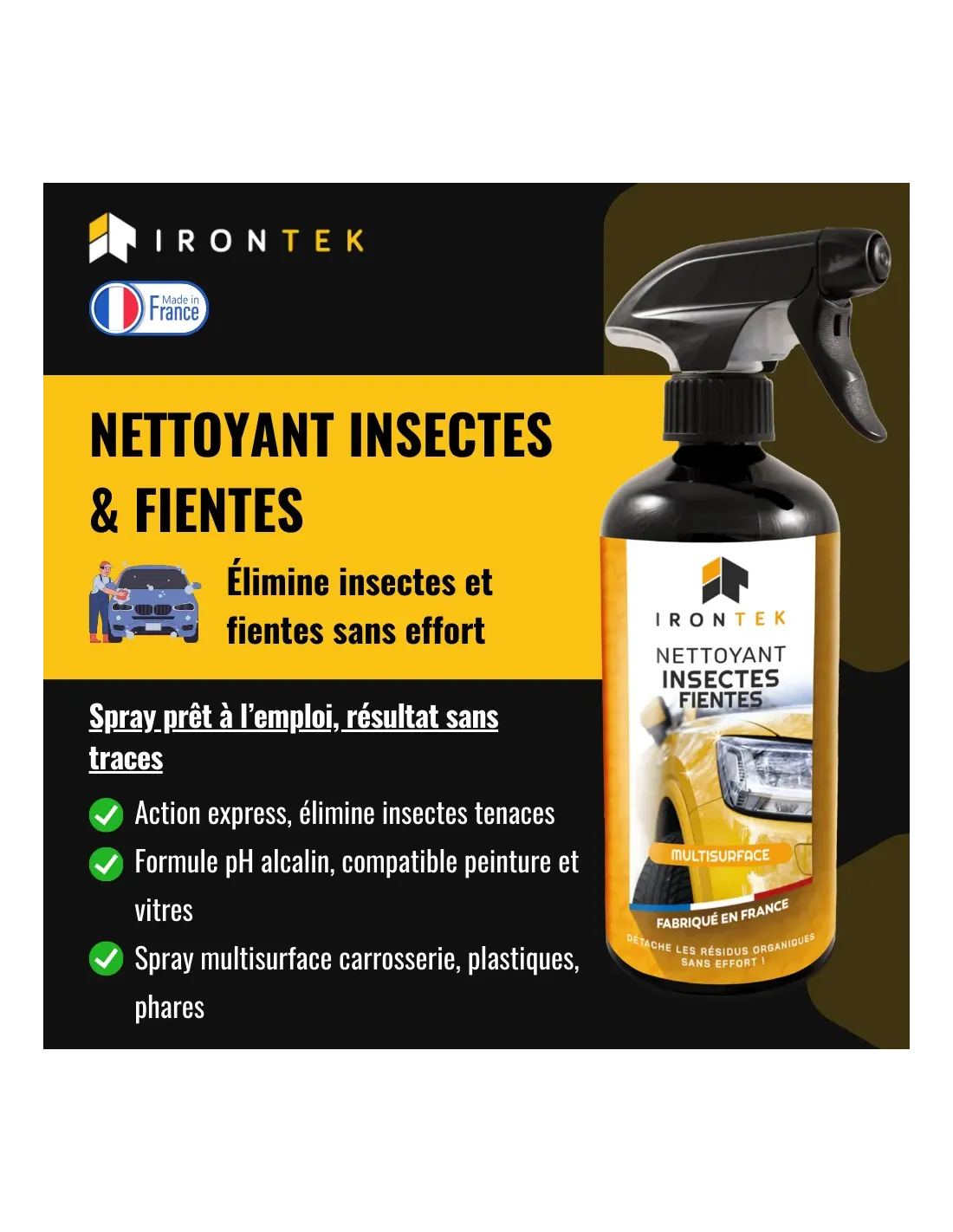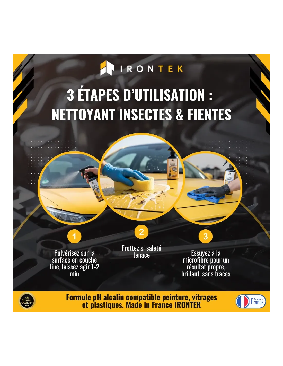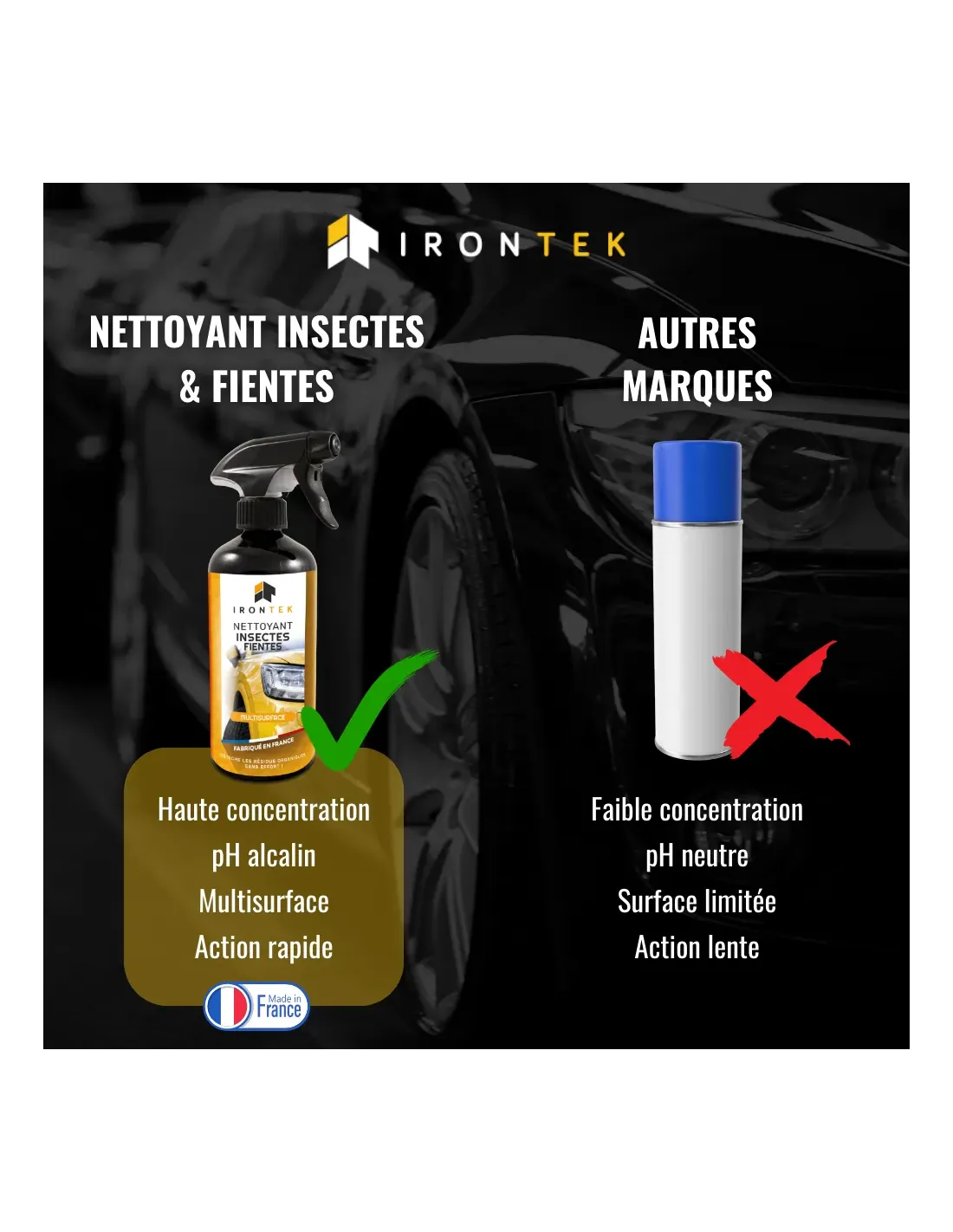Le Nettoyant Insectes Fientes IRONTEK a été spécialement conçu pour éliminer sans effort les résidus organiques (fientes, insectes, etc.) sur toutes les surfaces de carrosserie et vitrages.