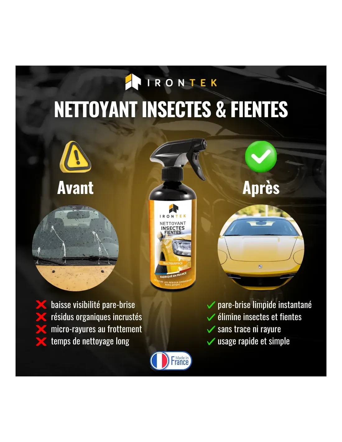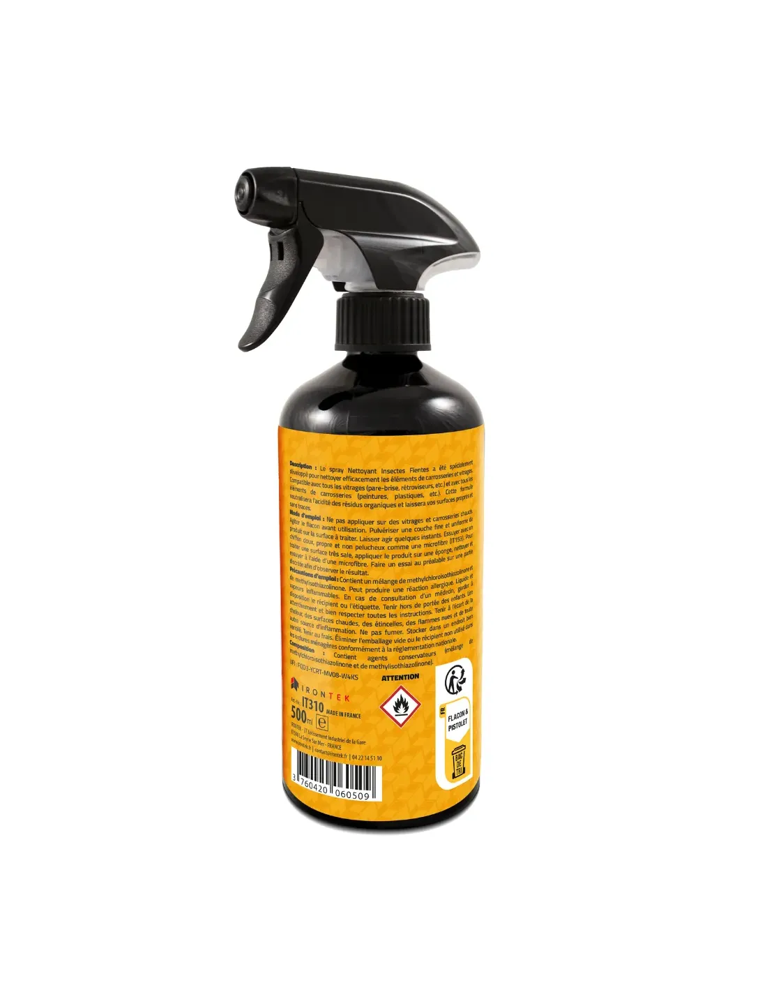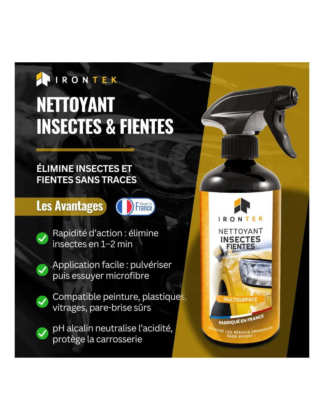Le Nettoyant Insectes Fientes IRONTEK a été spécialement conçu pour éliminer sans effort les résidus organiques (fientes, insectes, etc.) sur toutes les surfaces de carrosserie et vitrages.