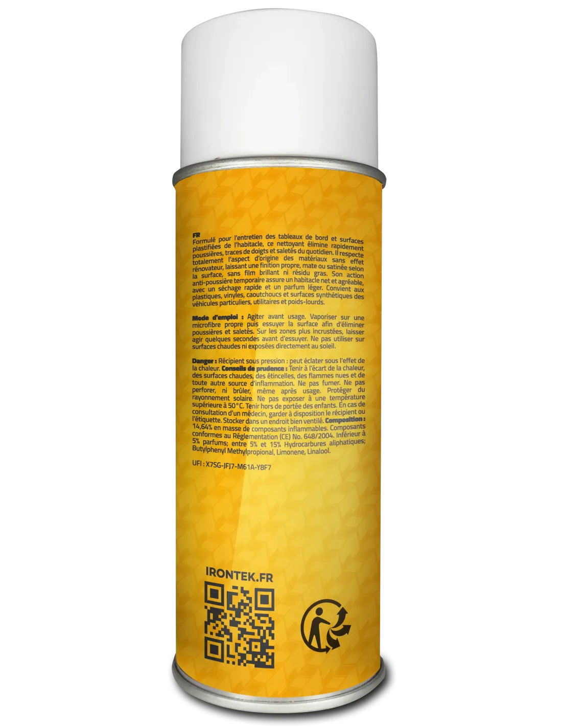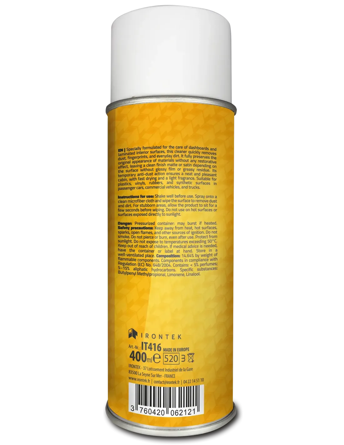 Formulé pour l’entretien des tableaux de bord et surfaces plastifiées de l’habitacle, ce nettoyant élimine rapidement poussières, traces de doigts et saletés du quotidien. Il respecte totalement l’aspect d’origine des matériaux sans effet rénovateur, laissant une finition propre, mate ou satinée selon la surface, sans film brillant ni résidu gras. Son action anti-poussière temporaire assure un habitacle net et agréable, avec un séchage rapide et un parfum léger. Convient aux plastiques, vinyles, caoutchoucs et surfaces synthétiques des véhicules particuliers, utilitaires et poids-lourds.
