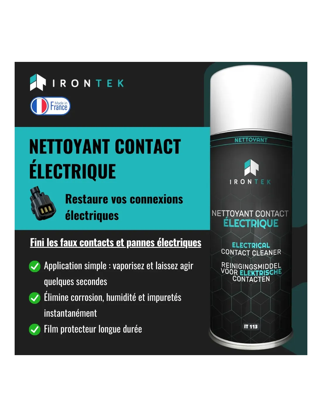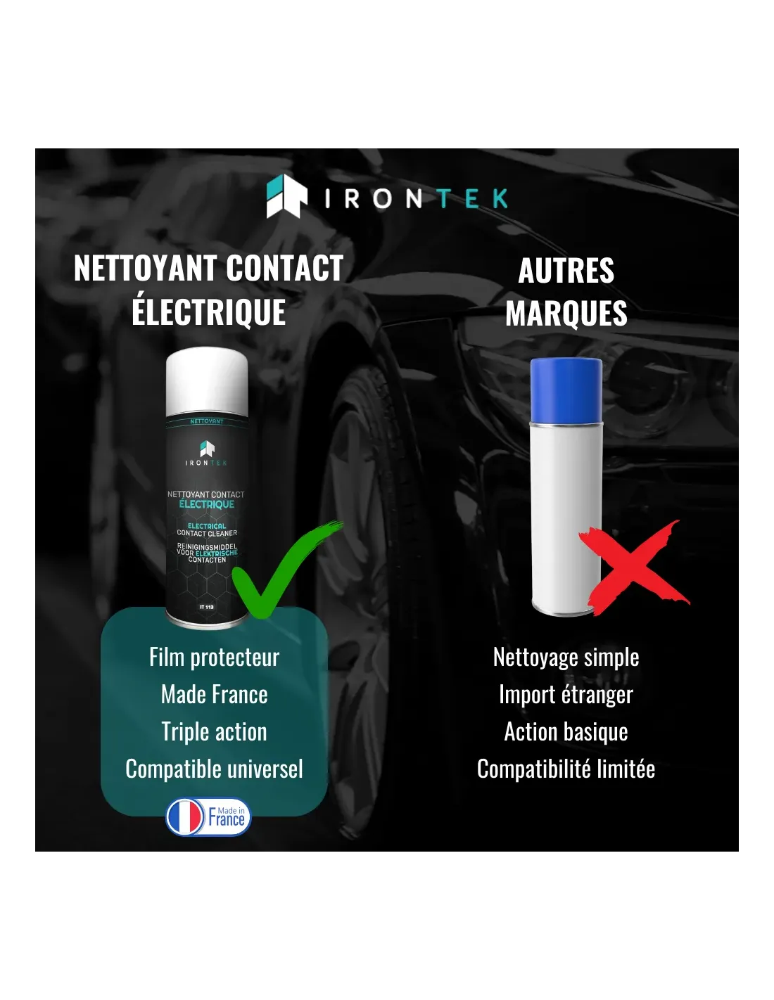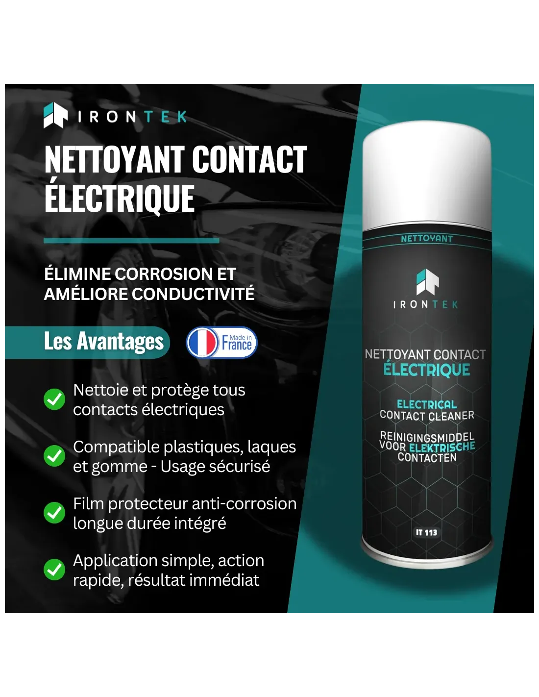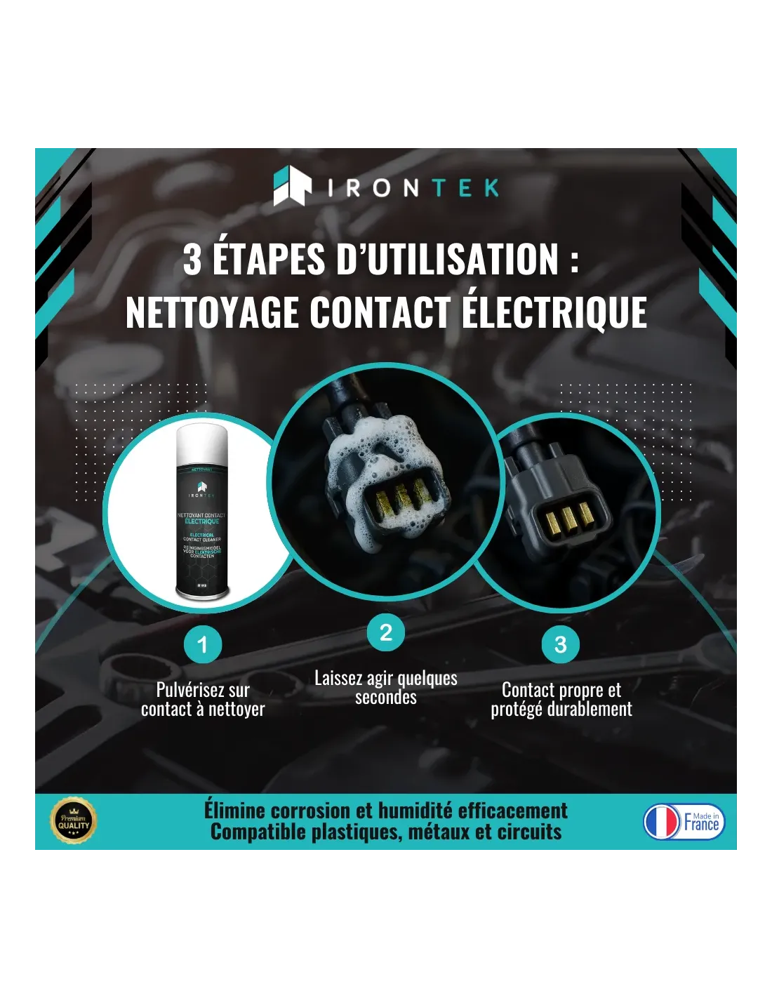 Astuce IRONTEK : appliquer sur les cosses corrodées pour restaurer une conductivité optimale et éviter leur oxydation à long terme.