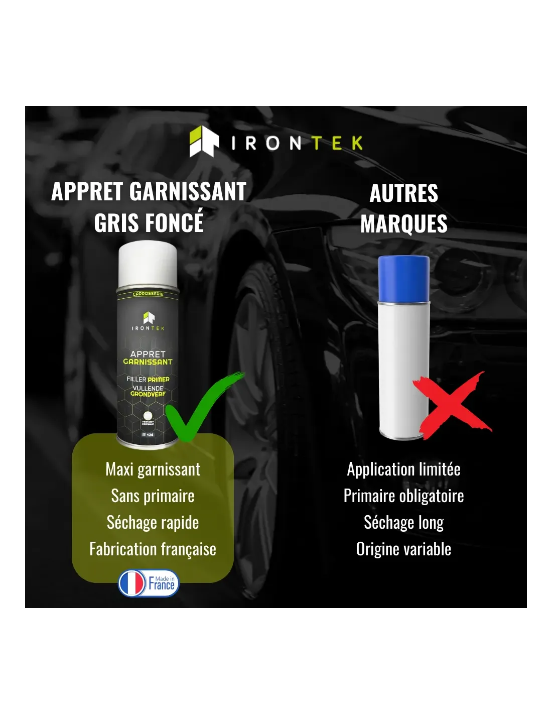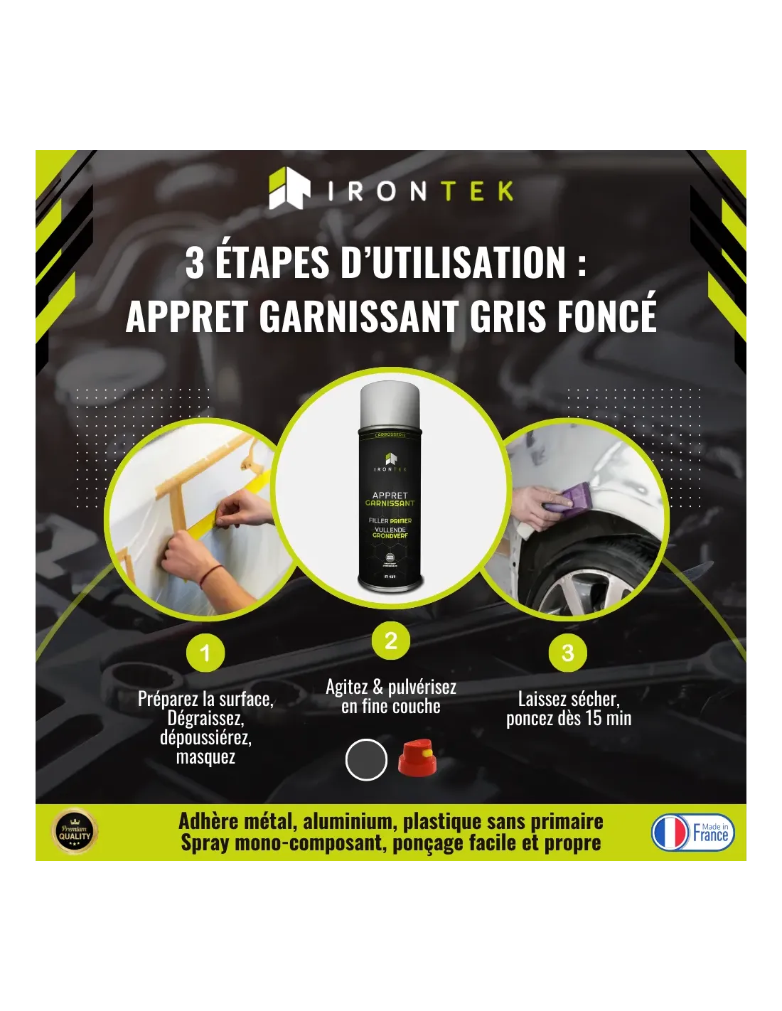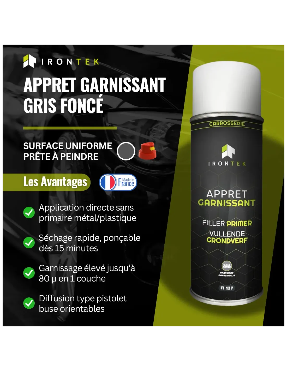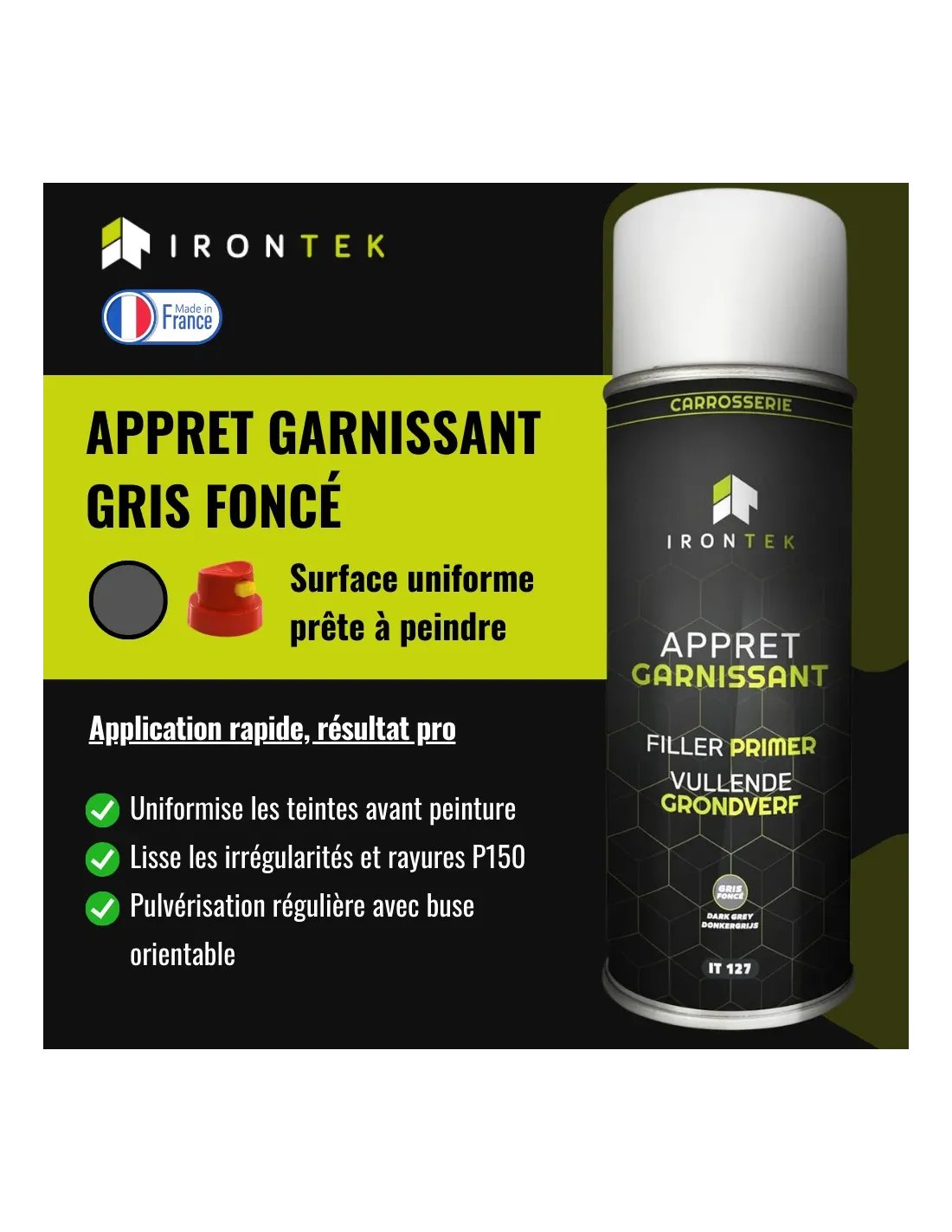 L’Apprêt Garnissant IRONTEK Gris Foncé est une solution idéale pour les professionnels de la préparation carrosserie, proposée sous forme de bombe aérosol pratique et efficace. Cet apprêt garnissant bombe permet de lisser les surfaces, corriger les défauts, et uniformiser la teinte avant mise en peinture.