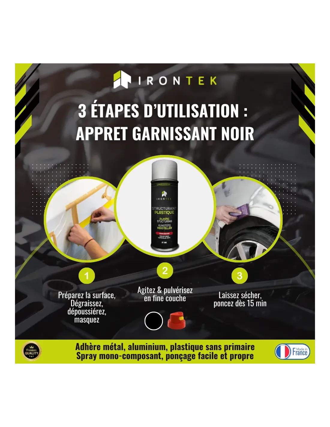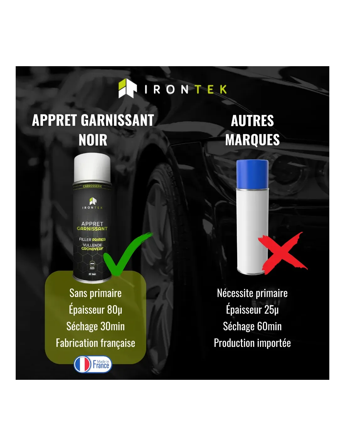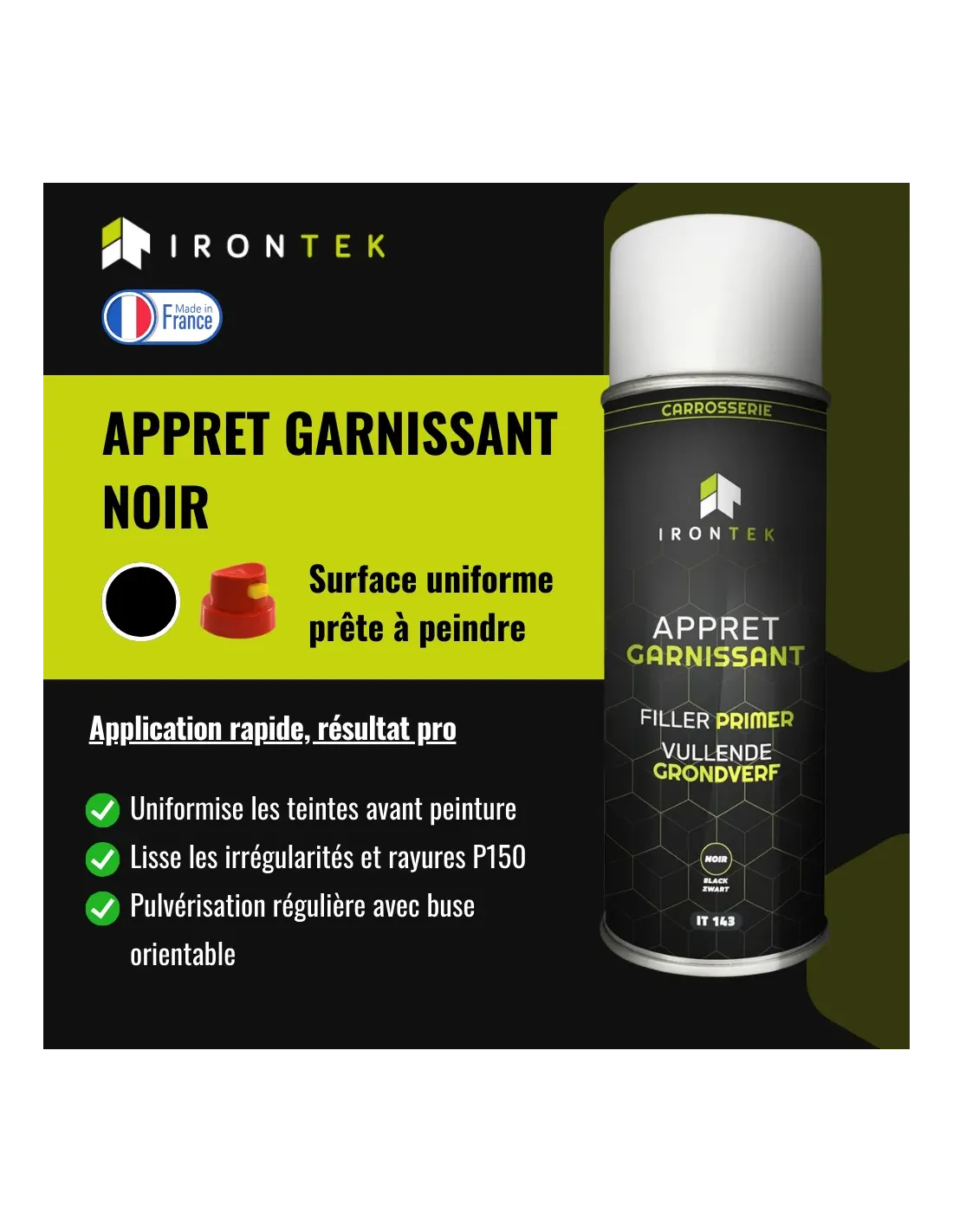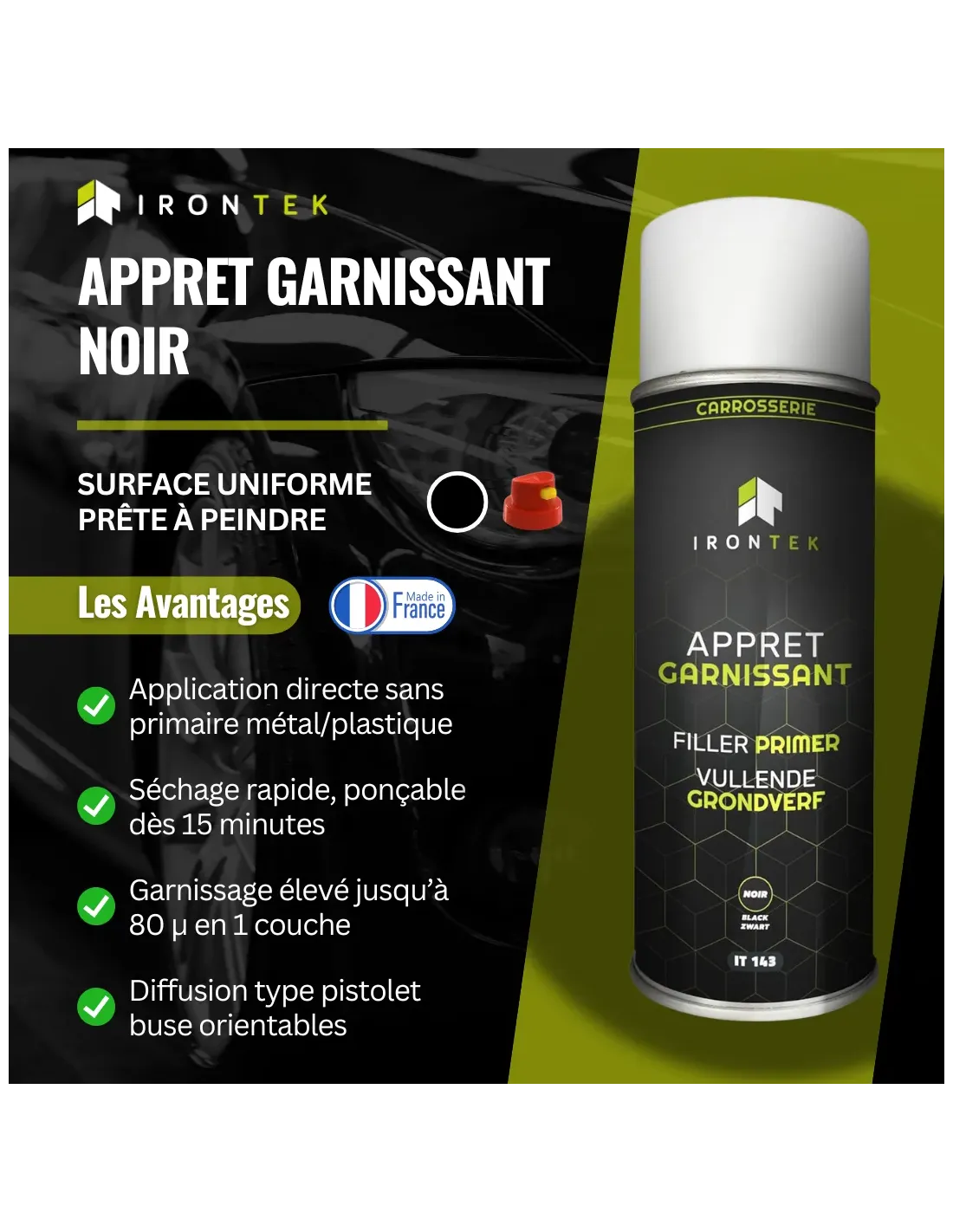 L’apprêt garnissant IRONTEK noir est un apprêt carrosserie en bombe conçu pour les travaux de préparation avant peinture. Sa formulation mono-composant permet une application simple et rapide, avec un rendu homogène proche d’un pistolet, grâce à sa buse « Wide Spray ».