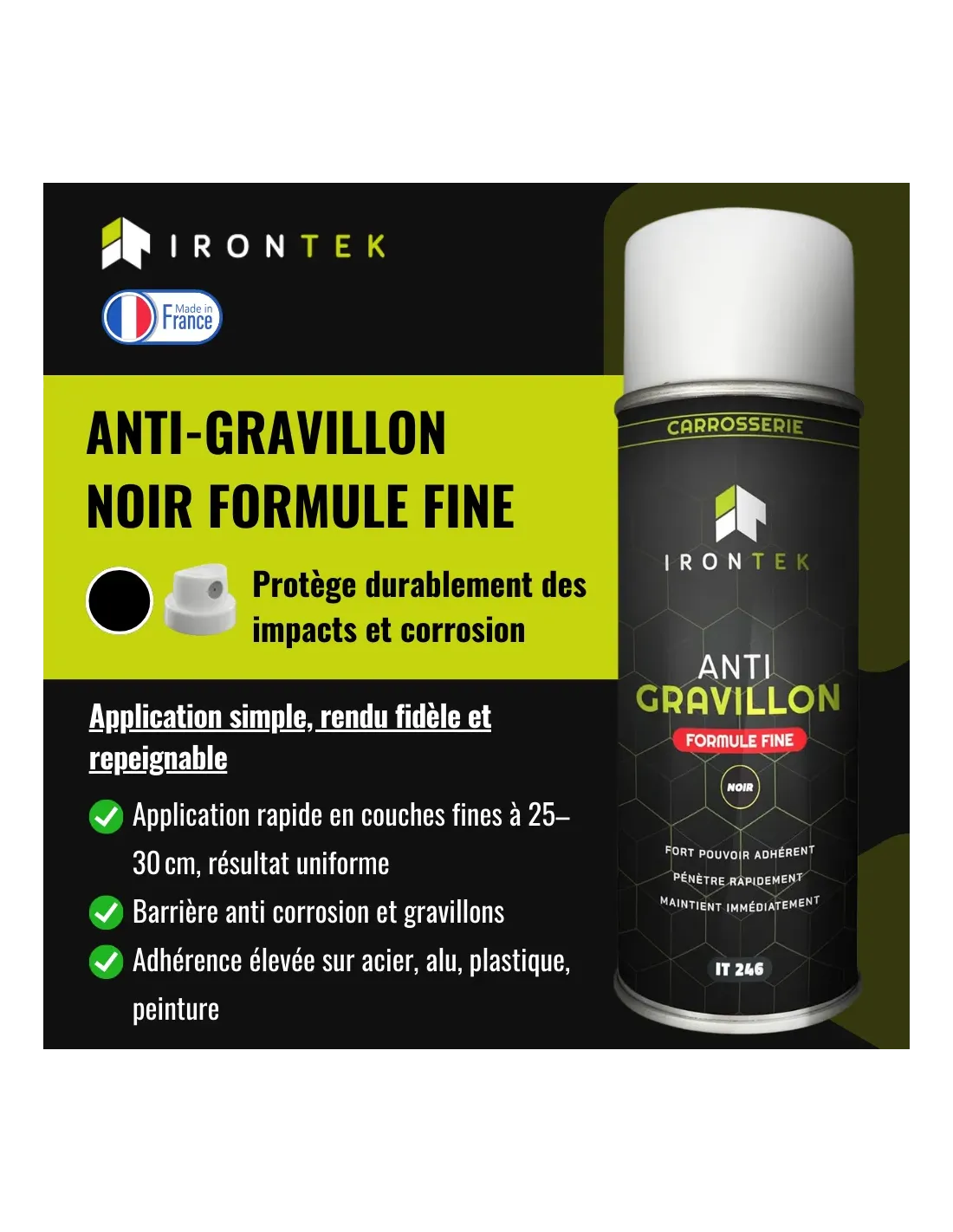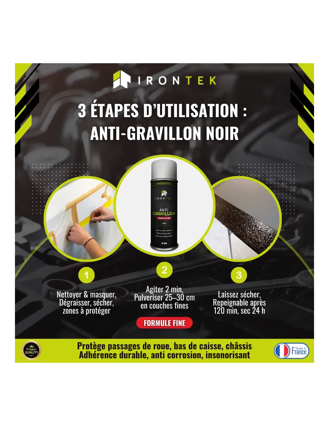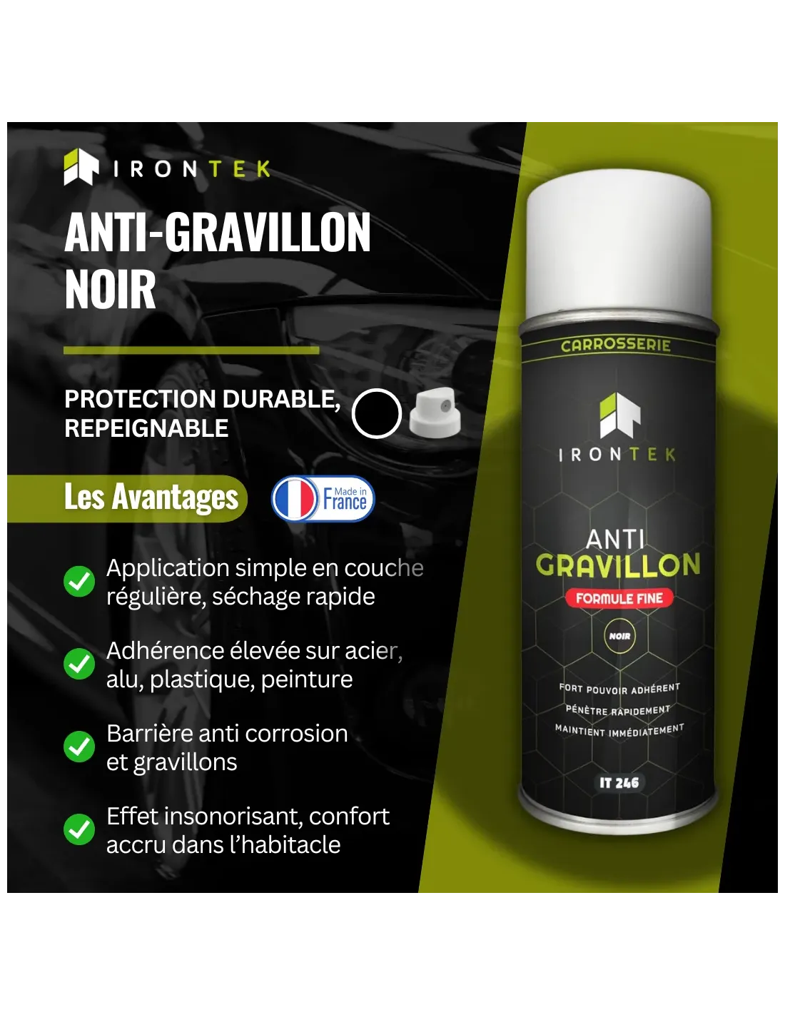 Sa formulation à base de résines synthétiques et caoutchoucs crée une barrière contre la corrosion, les projections de gravillons et l’usure mécanique. Il conserve sa souplesse, peut être peint après séchage complet, et possède d’excellentes propriétés insonorisantes.