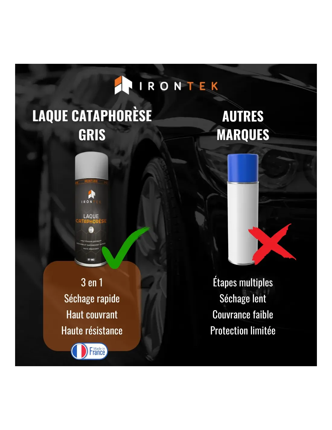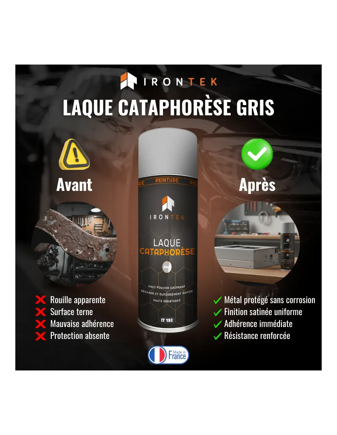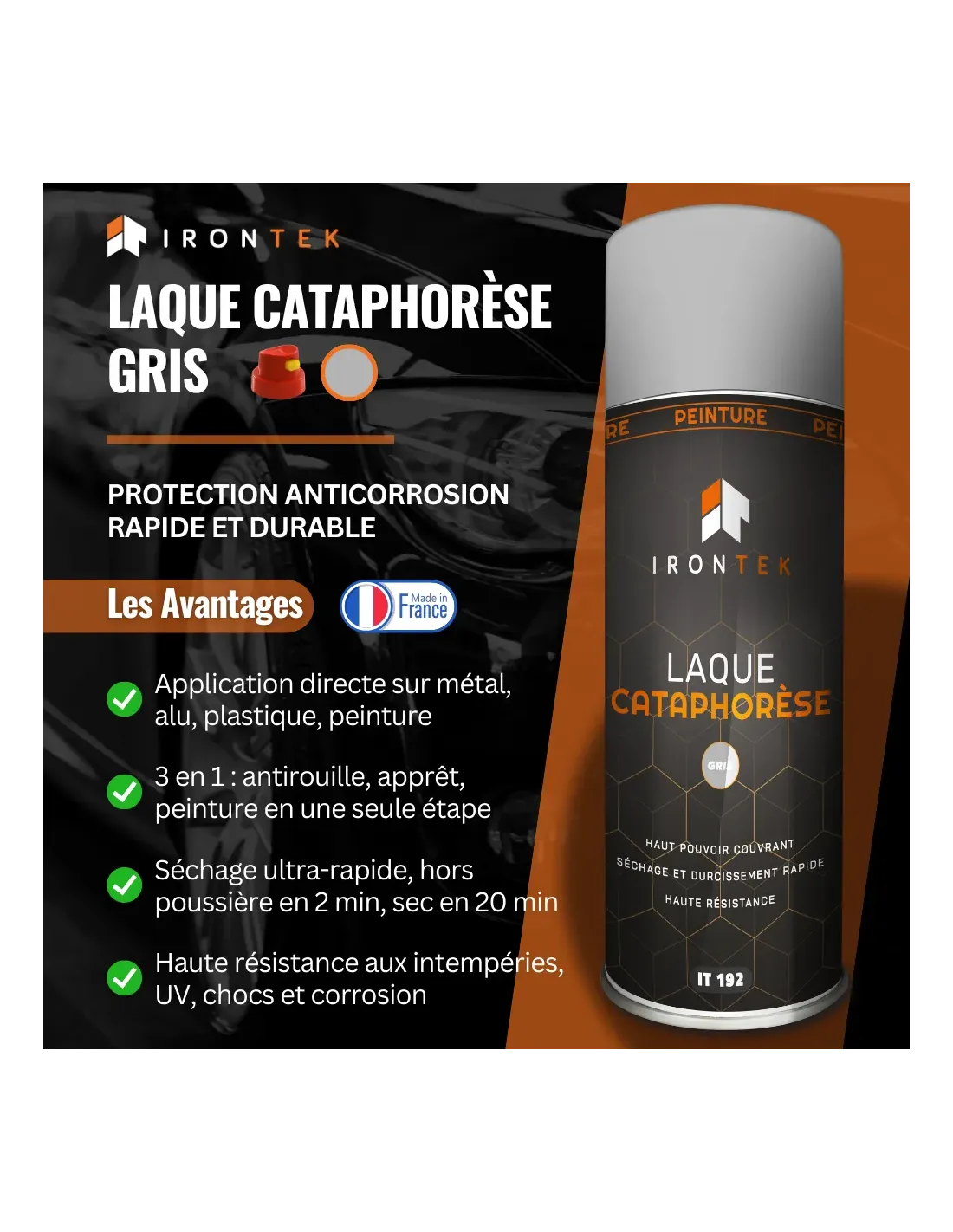 La Laque Cataphorèse IRONTEK est une laque de finition à base de résine nitro-combinée, formulée pour reproduire la couleur cataphorèse d’origine (beige, gris ou vert). Elle offre un haut pouvoir couvrant, adhère facilement sur le métal nu et sèche très rapidement pour une protection durable.