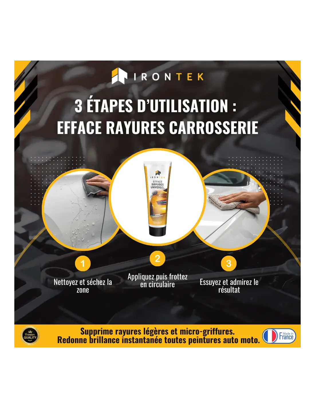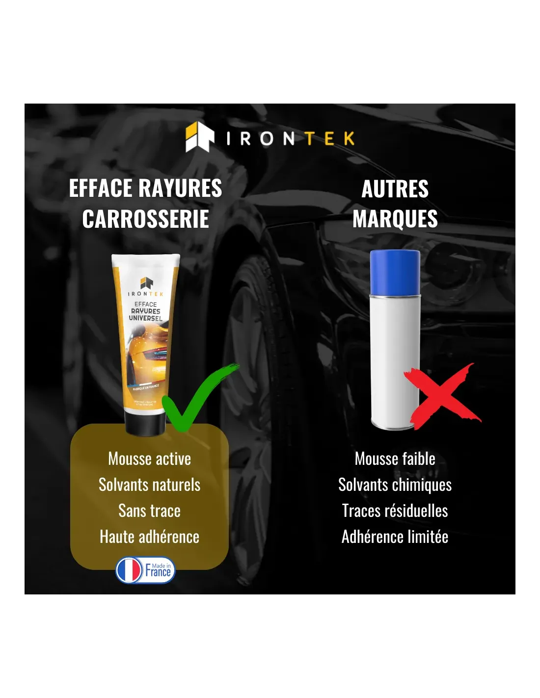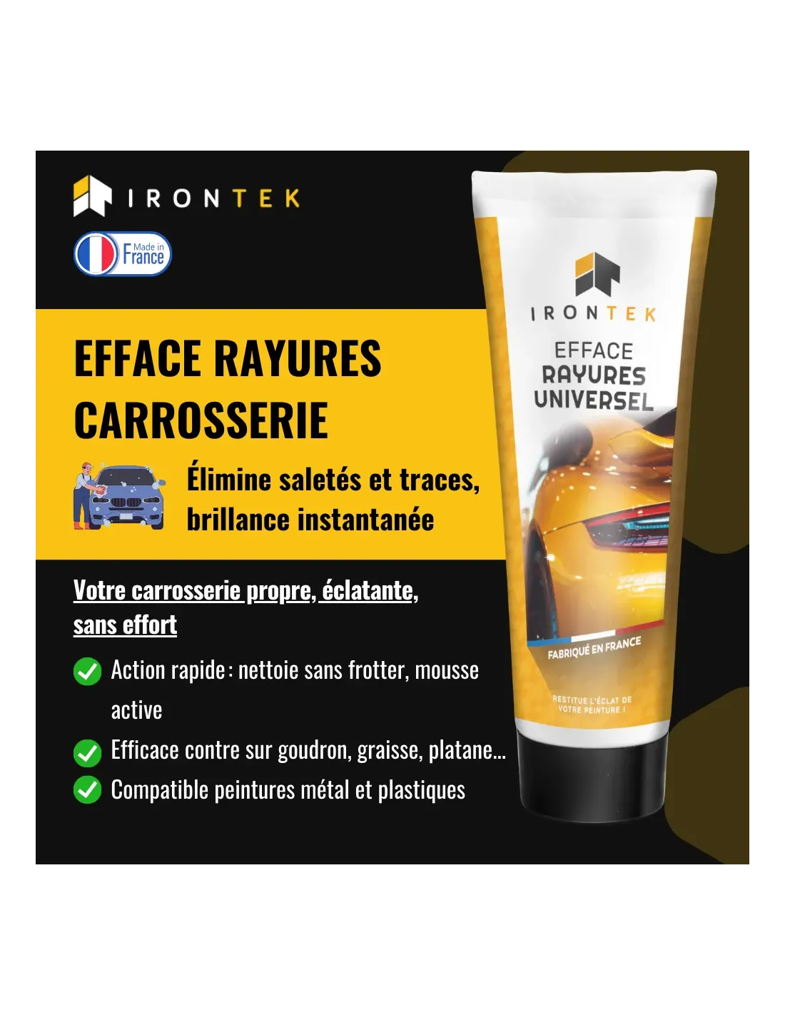 L’Efface Rayures Universel IRONTEK a été spécialement développé pour supprimer facilement les rayures légères et redonner tout son éclat à la carrosserie.