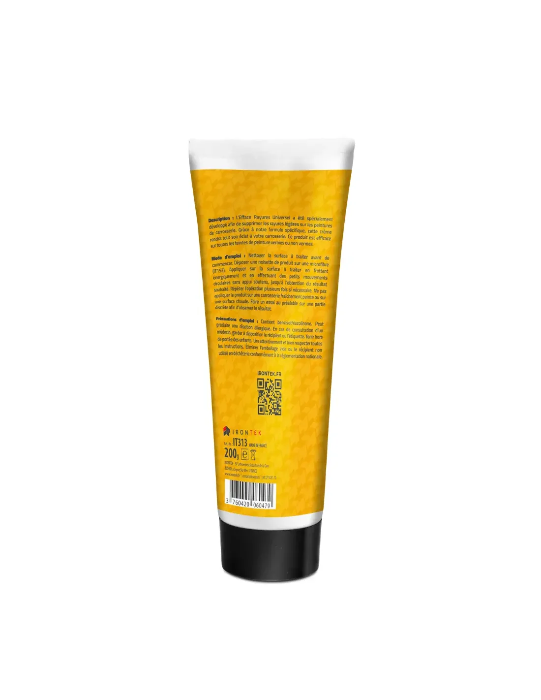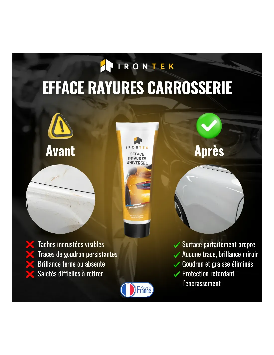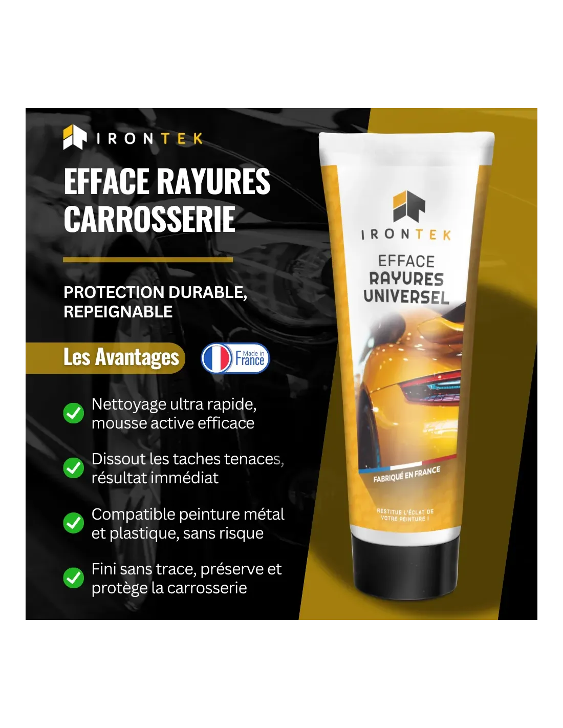 L’Efface Rayures Universel IRONTEK a été spécialement développé pour supprimer facilement les rayures légères et redonner tout son éclat à la carrosserie.